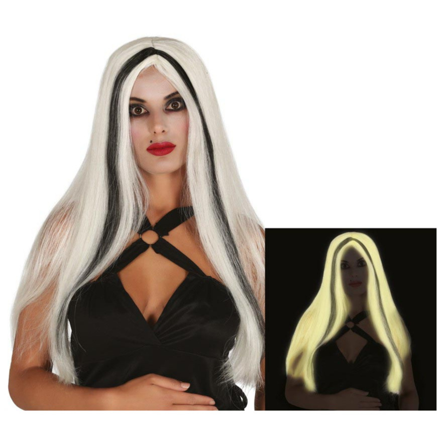 Halloween thema Glow in the dark verkleedpruik voor dames met lang los hangend haar in de kleur wit met zwarte streken. Lange lichtgevende dames pruik als toevoeging op uw verkleedkleding kostuum of jurk. Deze pruik kleurt geel/goud in het donker. Vergeet vooral ook de verkleed accessoires niet zoals sieraden, hoedjes, diadeems en tassen. Geschikt voor de horror verkleed thema’s zoals: Heksen, Vampier, Zombie, Spoken, dark lady/queen.