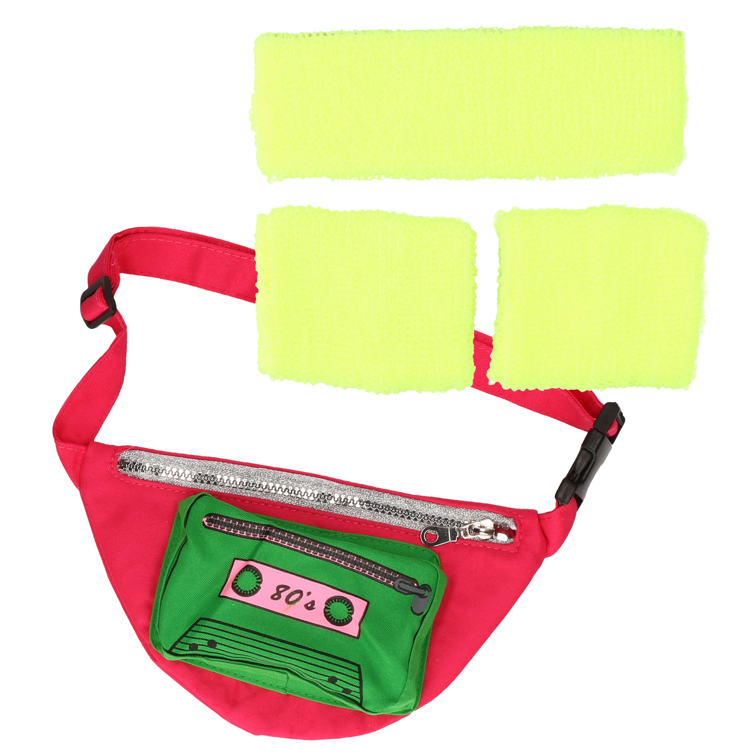 Foute 80s/90s party verkleed accessoire set 4-delig in neon geel. Maak je jaren 80/90 outfit helemaal compleet met dit accessoire setje tijdens je foute themafeestje of carnaval! Super handig want je kunt tijdens het dansen stylish je zweet afvegen, en al je nodige spullen bewaar je in het heuptasje.