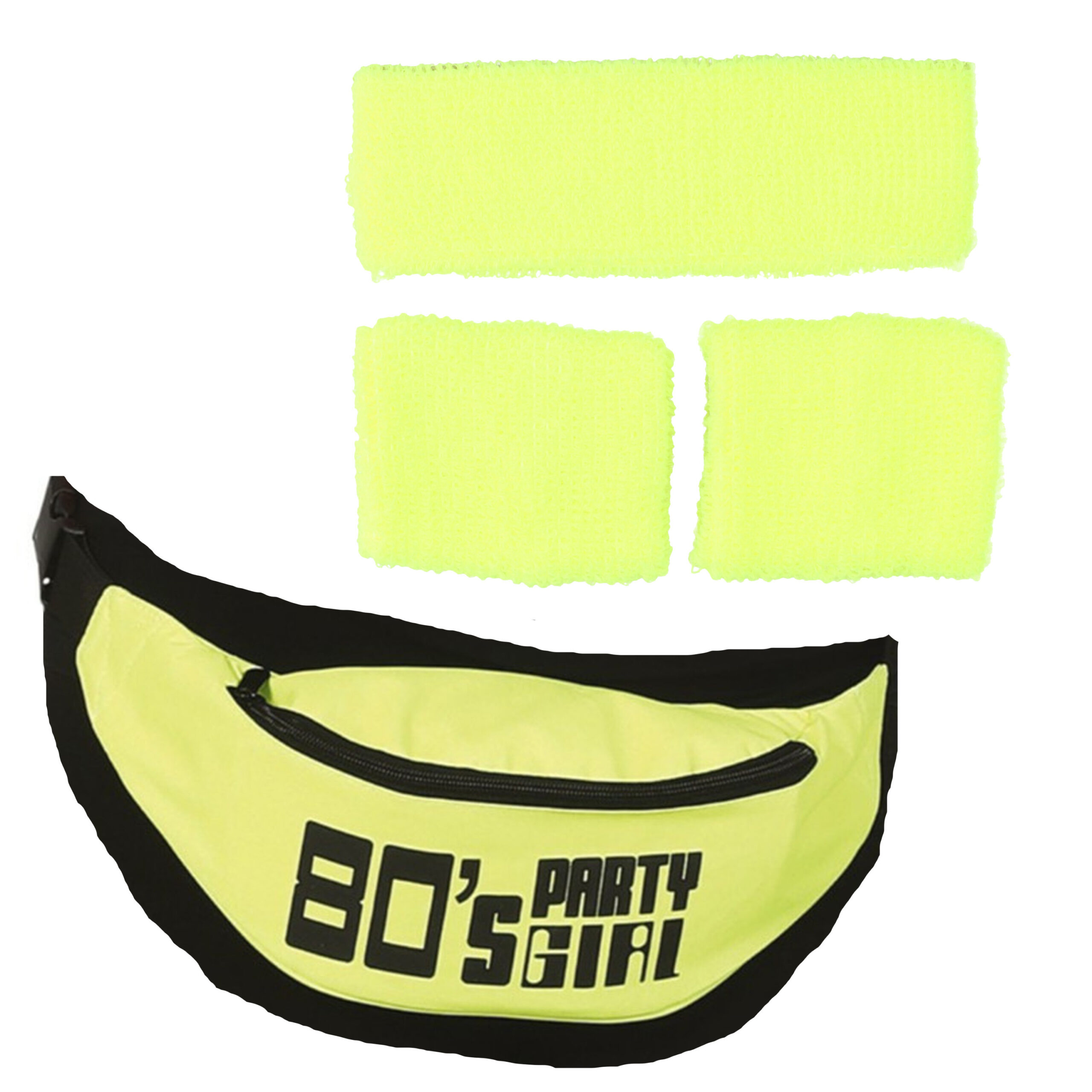 Foute 80s/90s party verkleed accessoire set 4-delig in neon geel. Maak je jaren 80/90 outfit helemaal compleet met dit accessoire setje tijdens je foute themafeestje of carnaval! Super handig want je kunt tijdens het dansen stylish je zweet afvegen, en al je nodige spullen bewaar je in het heuptasje.