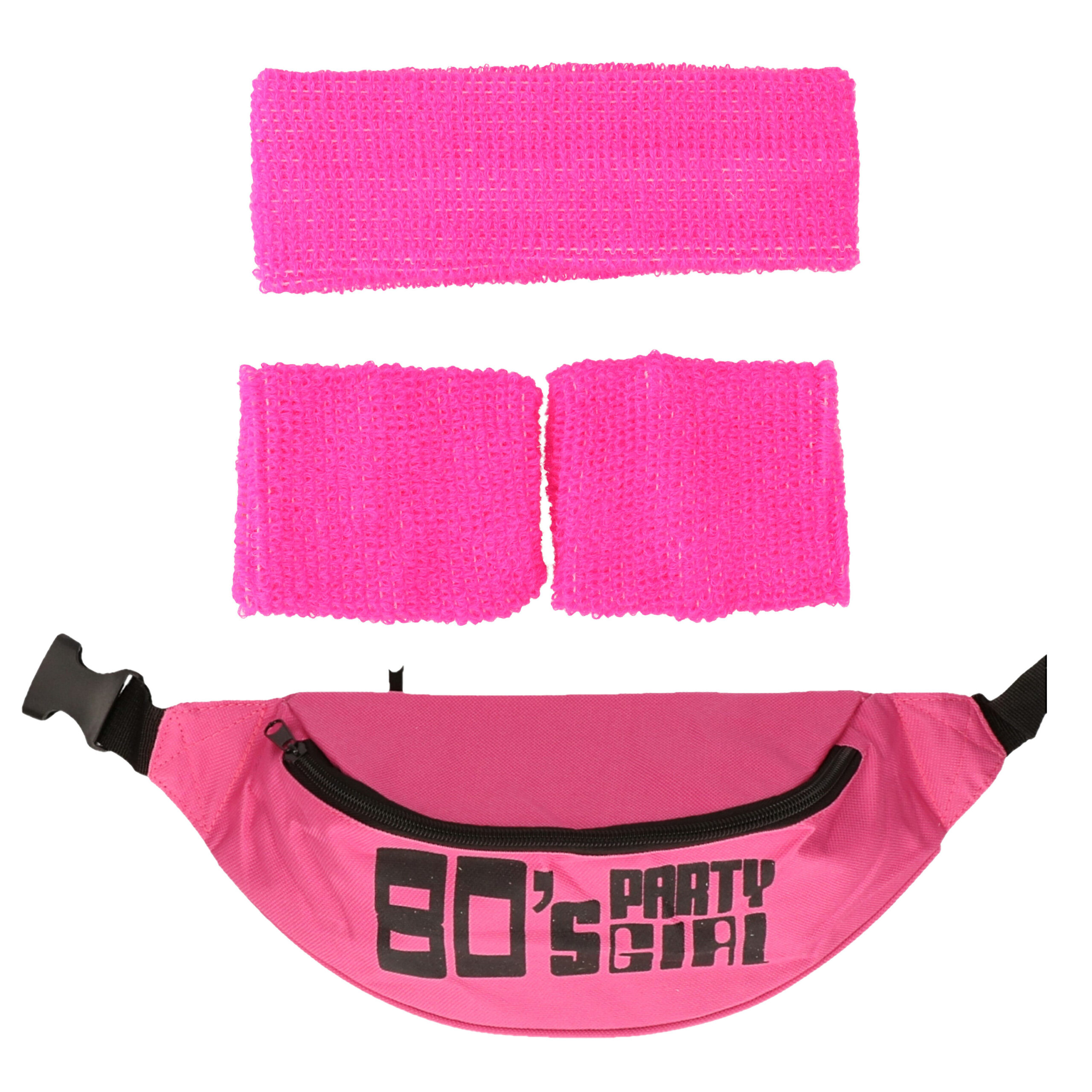 Foute 80s/90s party verkleed accessoire set 4-delig in neon roze. Maak je jaren 80/90 outfit helemaal compleet met dit accessoire setje tijdens je foute themafeestje of carnaval! Super handig want je kunt tijdens het dansen stylish je zweet afvegen, en al je nodige spullen bewaar je in het heuptasje.