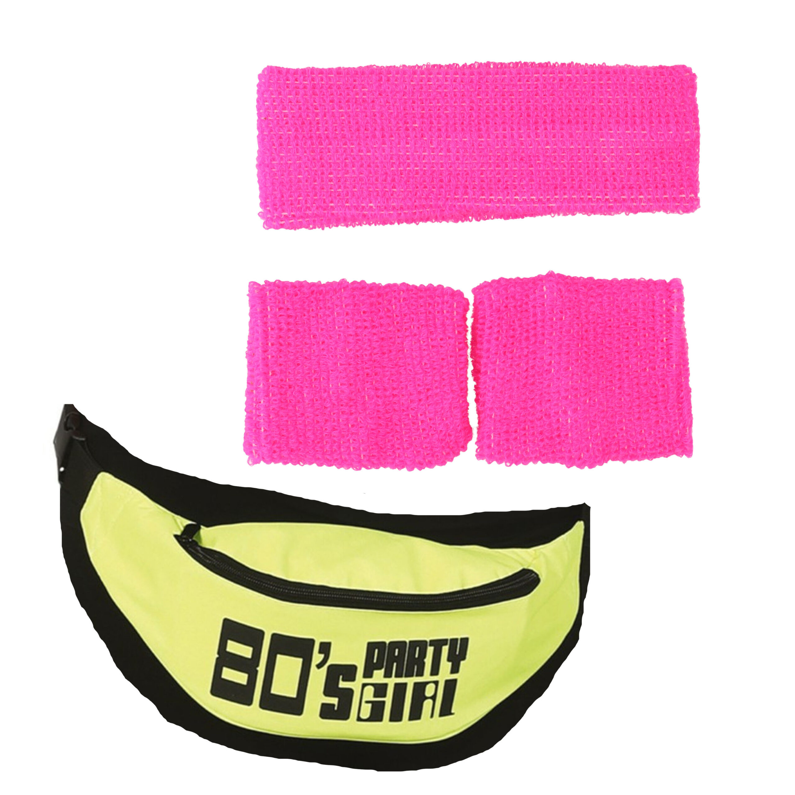 Foute 80s/90s party verkleed accessoire set 4-delig in neon roze. Maak je jaren 80/90 outfit helemaal compleet met dit accessoire setje tijdens je foute themafeestje of carnaval! Super handig want je kunt tijdens het dansen stylish je zweet afvegen, en al je nodige spullen bewaar je in het heuptasje.