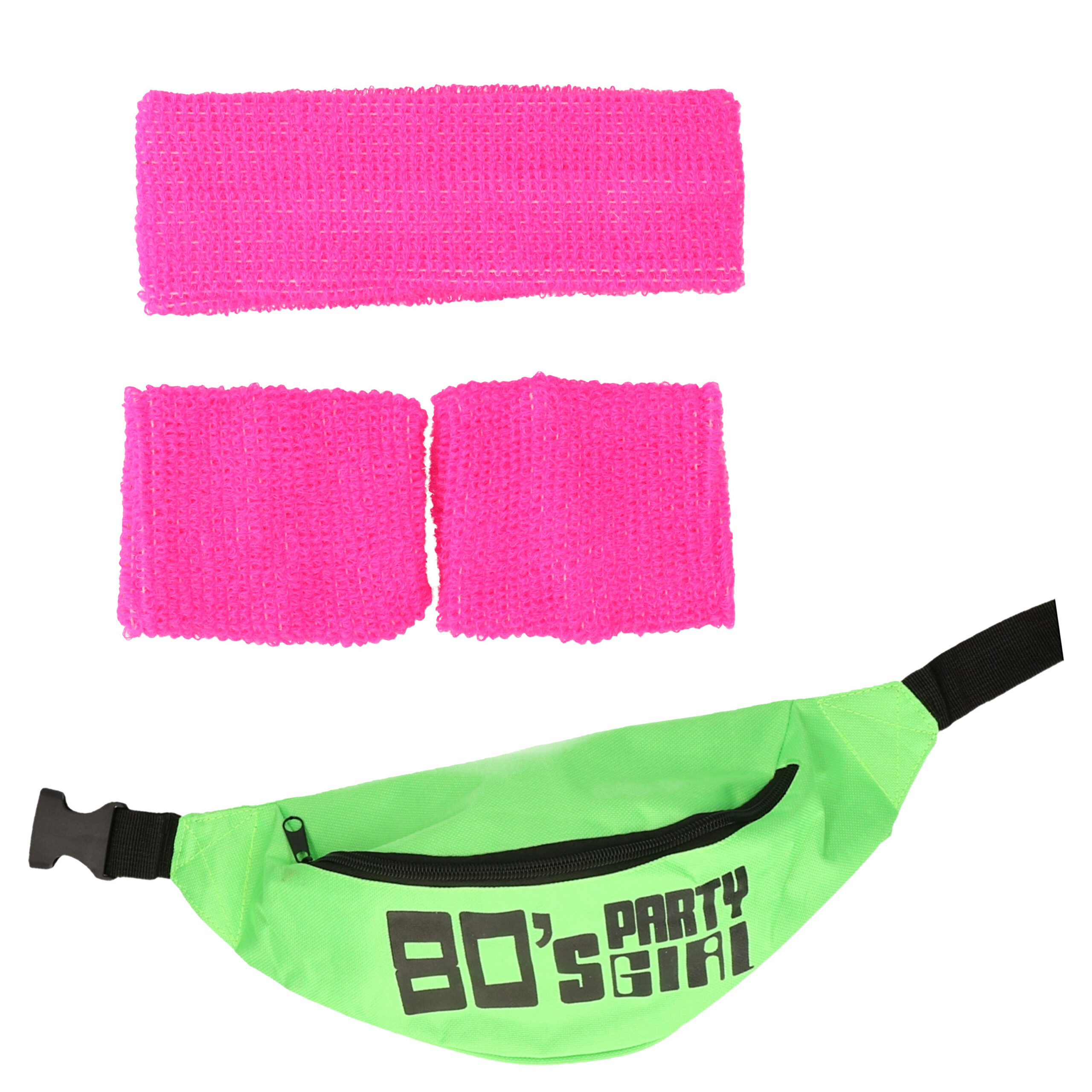 Foute 80s/90s party verkleed accessoire set 4-delig in neon roze. Maak je jaren 80/90 outfit helemaal compleet met dit accessoire setje tijdens je foute themafeestje of carnaval! Super handig want je kunt tijdens het dansen stylish je zweet afvegen, en al je nodige spullen bewaar je in het heuptasje.