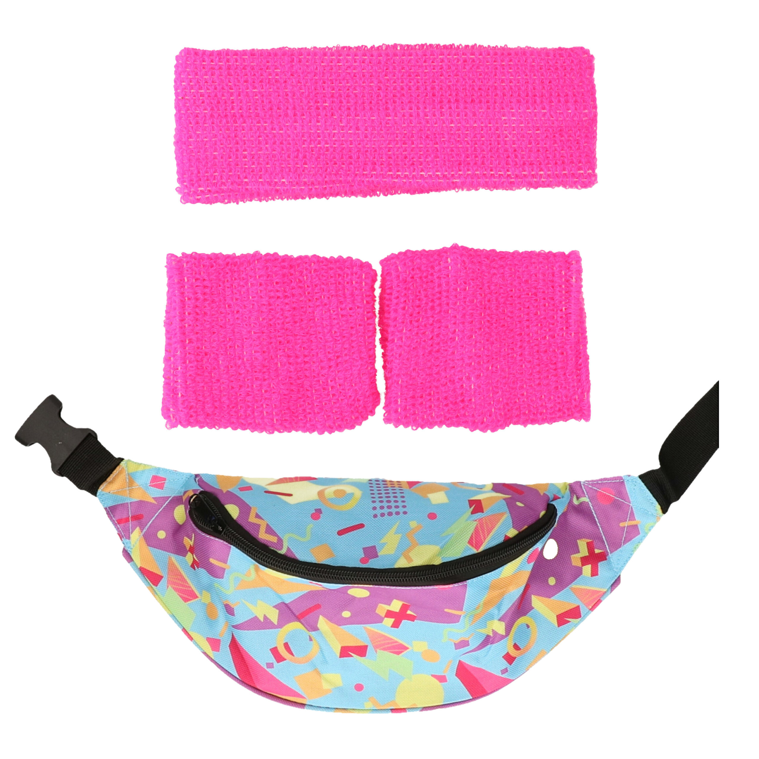 Foute 80s/90s party verkleed accessoire set 4-delig in neon roze. Maak je jaren 80/90 outfit helemaal compleet met dit accessoire setje tijdens je foute themafeestje of carnaval! Super handig want je kunt tijdens het dansen stylish je zweet afvegen, en al je nodige spullen bewaar je in het heuptasje.