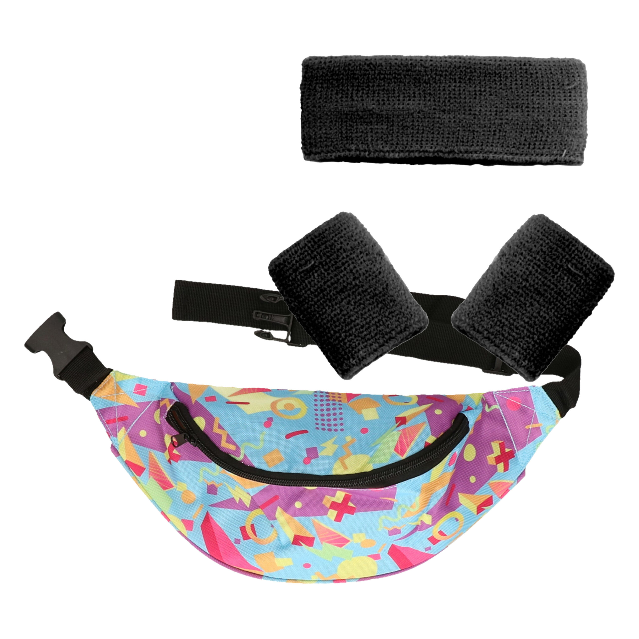 Complete foute 80s/90sparty verkleed accessoire/sieraden set voor dames. Maak de blits met dit kleurrijke setje tijdens je foute feestje of carnaval! Geschikt voor de themas: Eighties, jaren 80, Disco, Celeberties, Popsterren, Foute party. De set bestaat uit een heuptasje, 2x pols zweetbandjes, 1x hoofd zweetband. Materiaal: polyester. , Dit artikel bestaat uit:, 1x Foute 80s/90s print party heuptasje – blauw – jaren 80/90 verkleed accessoires – volwassenen, 1x Foute 80s/90s party verkleed accessoire zweetbandjes set – zwart – jaren 80/90 thema feestje