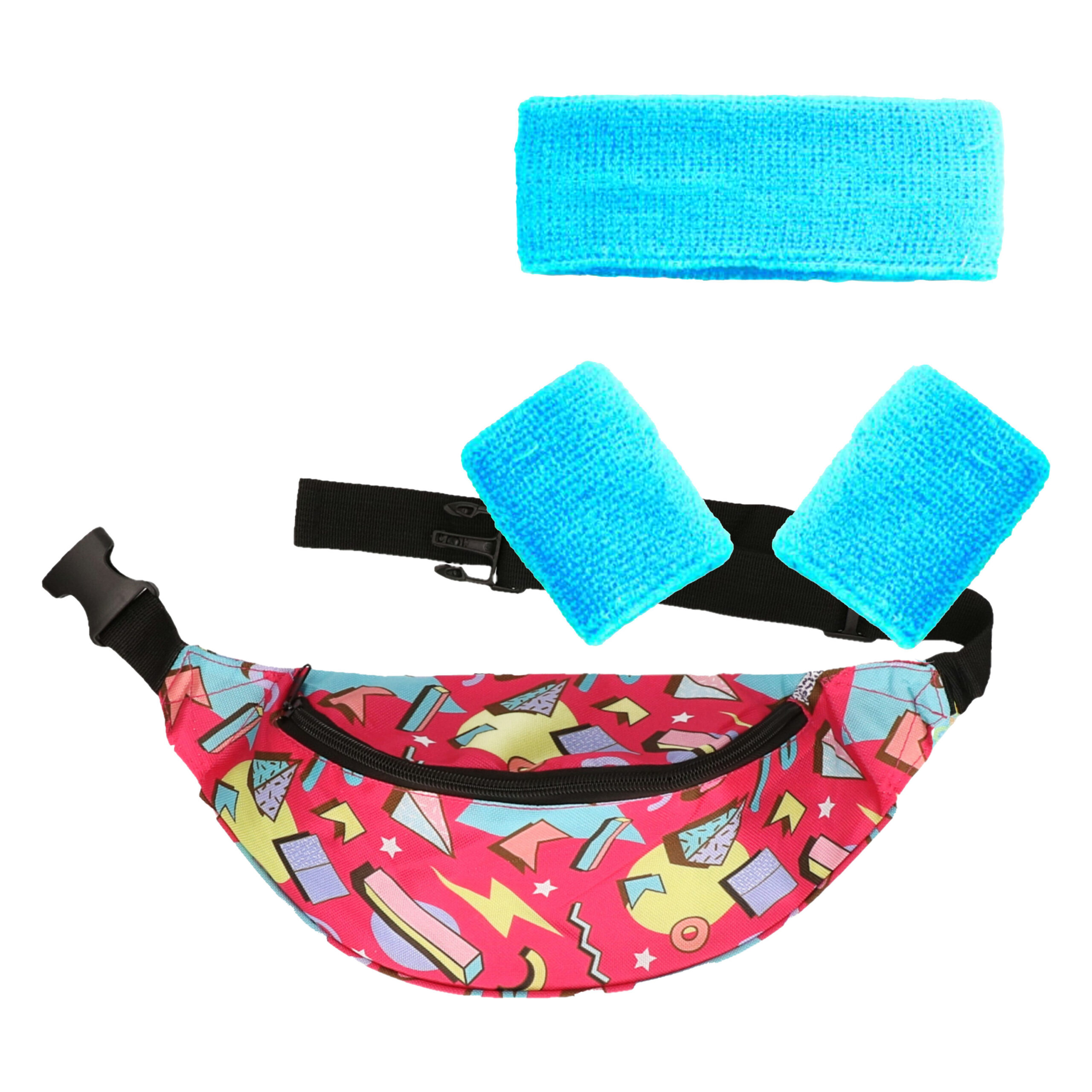 Complete foute 80s/90sparty verkleed accessoire/sieraden set voor dames. Maak de blits met dit kleurrijke setje tijdens je foute feestje of carnaval! Geschikt voor de themas: Eighties, jaren 80, Disco, Celeberties, Popsterren, Foute party. De set bestaat uit een heuptasje, 2x pols zweetbandjes, 1x hoofd zweetband. Materiaal: polyester. , Dit artikel bestaat uit:, 1x Foute 80s/90s print party heuptasje – roze – jaren 80/90 verkleed accessoires – volwassenen, 1x Foute 80s/90s party verkleed accessoire zweetbandjes set – turquoise – jaren 80/90 thema feestje