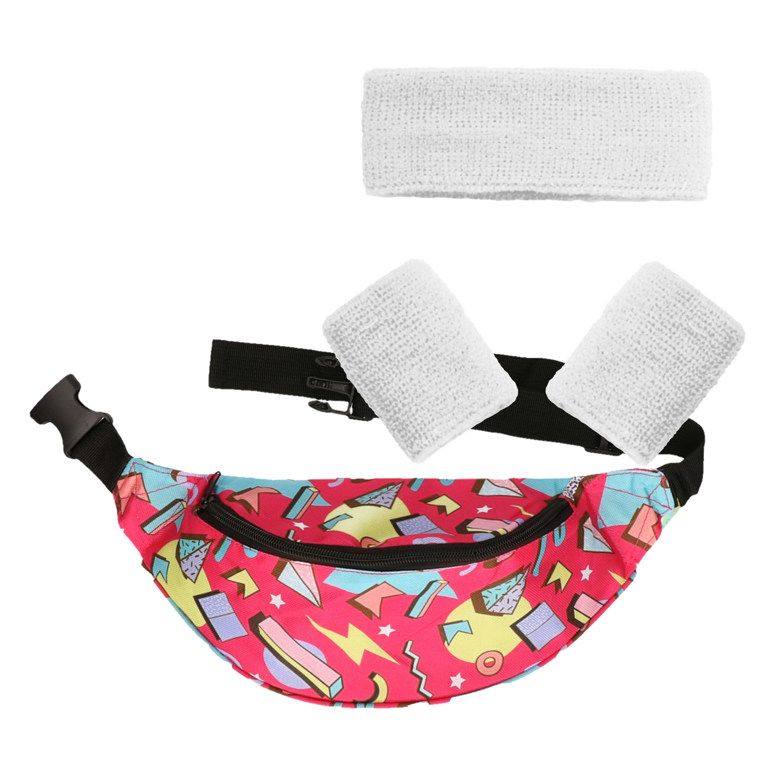 Complete foute 80s/90sparty verkleed accessoire/sieraden set voor dames. Maak de blits met dit kleurrijke setje tijdens je foute feestje of carnaval! Geschikt voor de themas: Eighties, jaren 80, Disco, Celeberties, Popsterren, Foute party. De set bestaat uit een heuptasje, 2x pols zweetbandjes, 1x hoofd zweetband. Materiaal: polyester. , Dit artikel bestaat uit:, 1x Foute 80s/90s print party heuptasje – roze – jaren 80/90 verkleed accessoires – volwassenen, 1x Foute 80s/90s party verkleed accessoire zweetbandjes set – wit – jaren 80/90 thema feestje