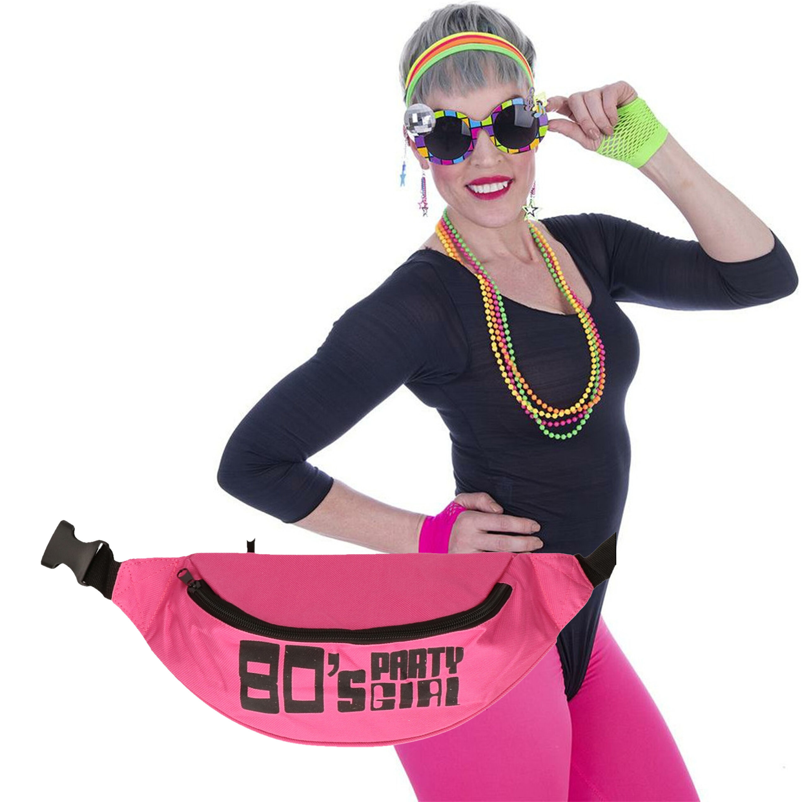 Complete foute 80s/90sparty verkleed accessoire/sieraden set voor dames. Maak de blits met dit kleurrijke setje tijdens je foute feestje of carnaval! Geschikt voor de themas: Eighties, jaren 80, Disco, Celeberties, Popsterren, Foute party. De set bestaat uit een heuptasje, zonnebril, kettingen, oorbellen en haarbandjes. , Dit artikel bestaat uit:, 1x Foute 80s/90s print party heuptasje – fuchsia roze – jaren 80/90 verkleed accessoires – volwassenen, 1x Eighties/Jaren 80 verkleedset – ketting/bril/handschoenen/bandjes – voor dames
