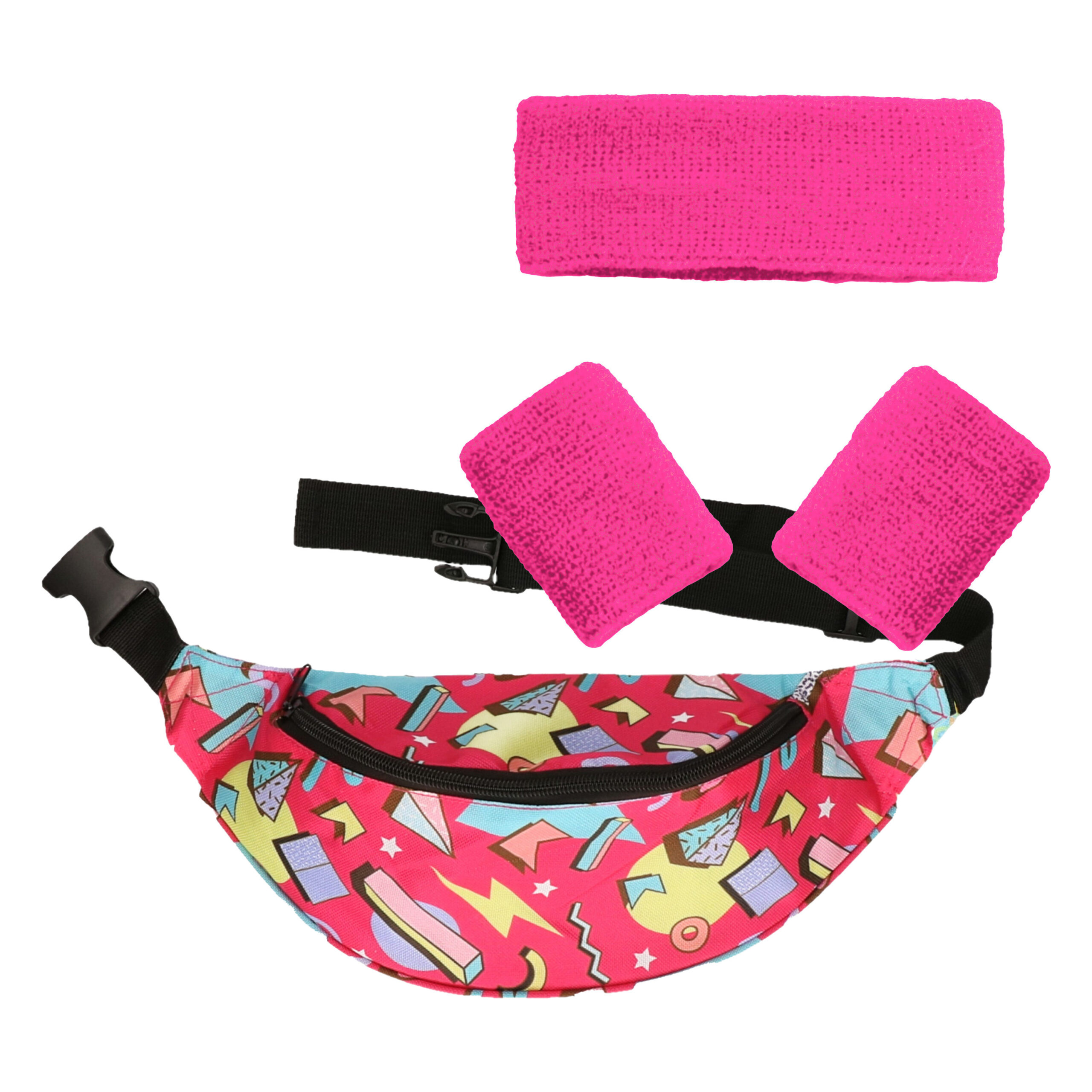 Complete foute 80s/90sparty verkleed accessoire/sieraden set voor dames. Maak de blits met dit kleurrijke setje tijdens je foute feestje of carnaval! Geschikt voor de themas: Eighties, jaren 80, Disco, Celeberties, Popsterren, Foute party. De set bestaat uit een heuptasje, 2x pols zweetbandjes, 1x hoofd zweetband. Materiaal: polyester. , Dit artikel bestaat uit:, 1x Foute 80s/90s print party heuptasje – roze – jaren 80/90 verkleed accessoires – volwassenen, 1x Foute 80s/90s party verkleed accessoire zweetbandjes set – neon roze- jaren 80/90 thema feestje