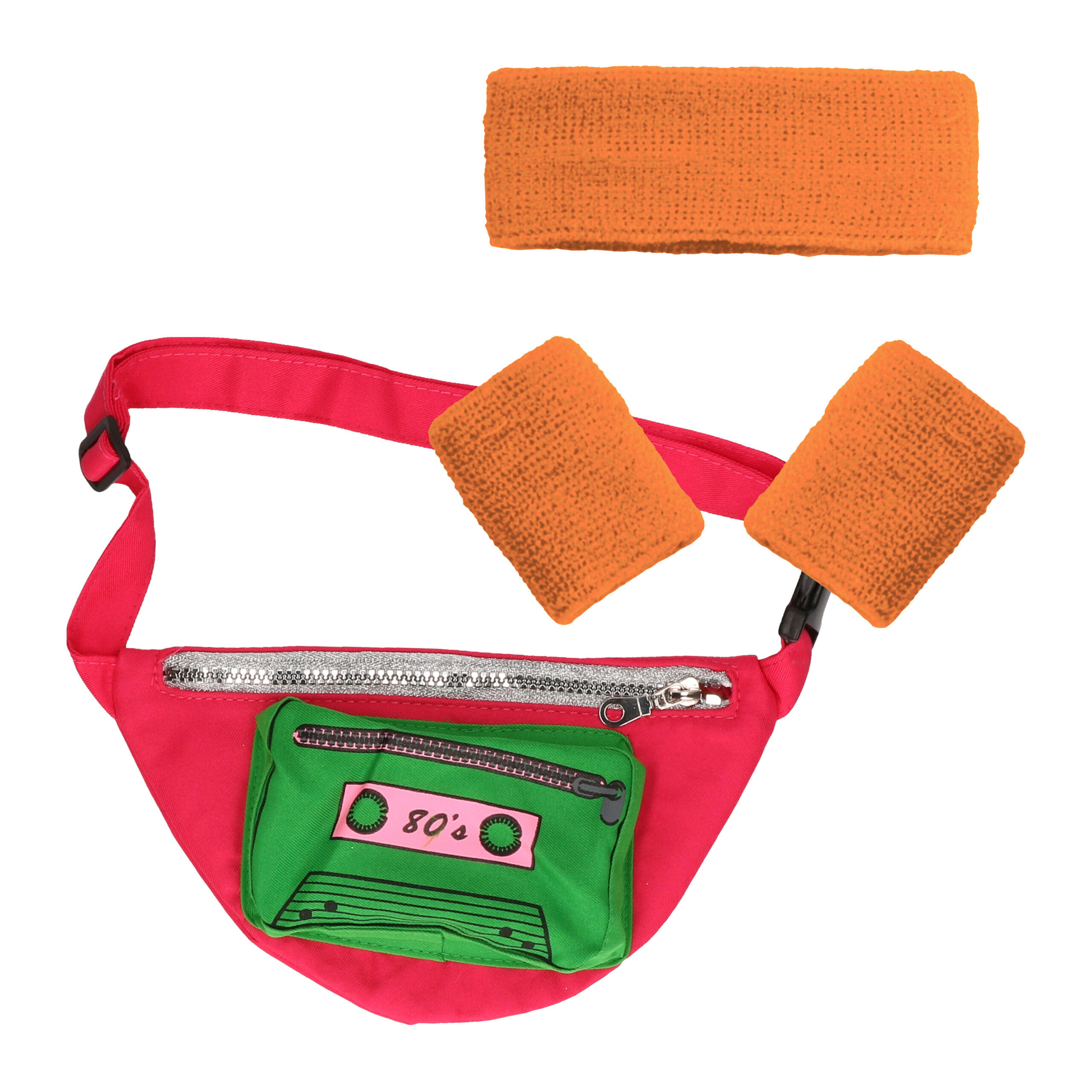 Complete foute 80s/90sparty verkleed accessoire/sieraden set voor dames. Maak de blits met dit kleurrijke setje tijdens je foute feestje of carnaval! Geschikt voor de themas: Eighties, jaren 80, Disco, Celeberties, Popsterren, Foute party. De set bestaat uit een heuptasje, 2x pols zweetbandjes, 1x hoofd zweetband. Materiaal: polyester. , Dit artikel bestaat uit:, 1x Foute 80s/90s print party heuptasje – roze – jaren 80/90 verkleed accessoires – volwassenen, 1x Foute 80s/90s party verkleed accessoire zweetbandjes set – neon oranje – jaren 80/90 thema feestje