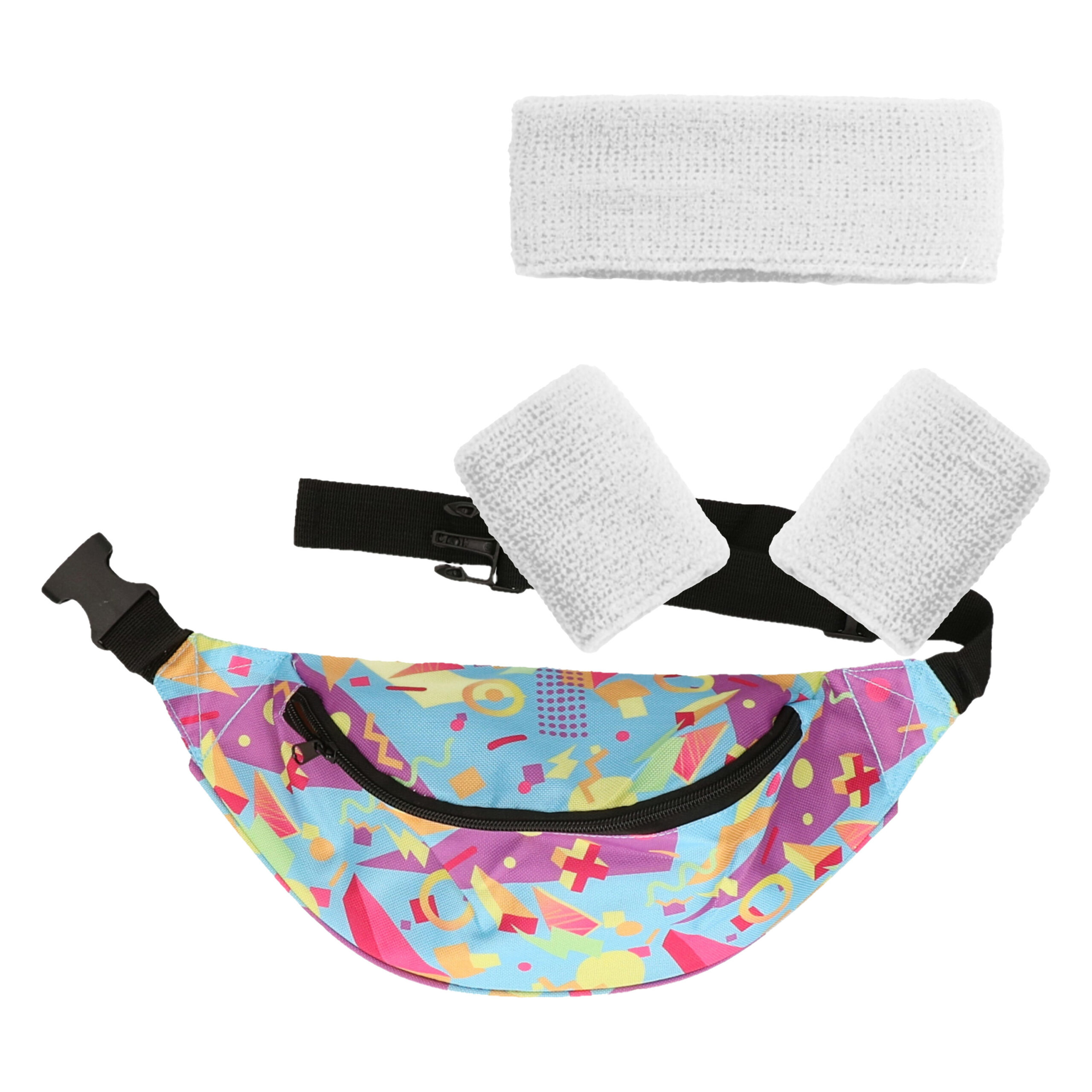 Complete foute 80s/90sparty verkleed accessoire/sieraden set voor dames. Maak de blits met dit kleurrijke setje tijdens je foute feestje of carnaval! Geschikt voor de themas: Eighties, jaren 80, Disco, Celeberties, Popsterren, Foute party. De set bestaat uit een heuptasje, 2x pols zweetbandjes, 1x hoofd zweetband. Materiaal: polyester. , Dit artikel bestaat uit:, 1x Foute 80s/90s print party heuptasje – blauw – jaren 80/90 verkleed accessoires – volwassenen, 1x Foute 80s/90s party verkleed accessoire zweetbandjes set – wit – jaren 80/90 thema feestje