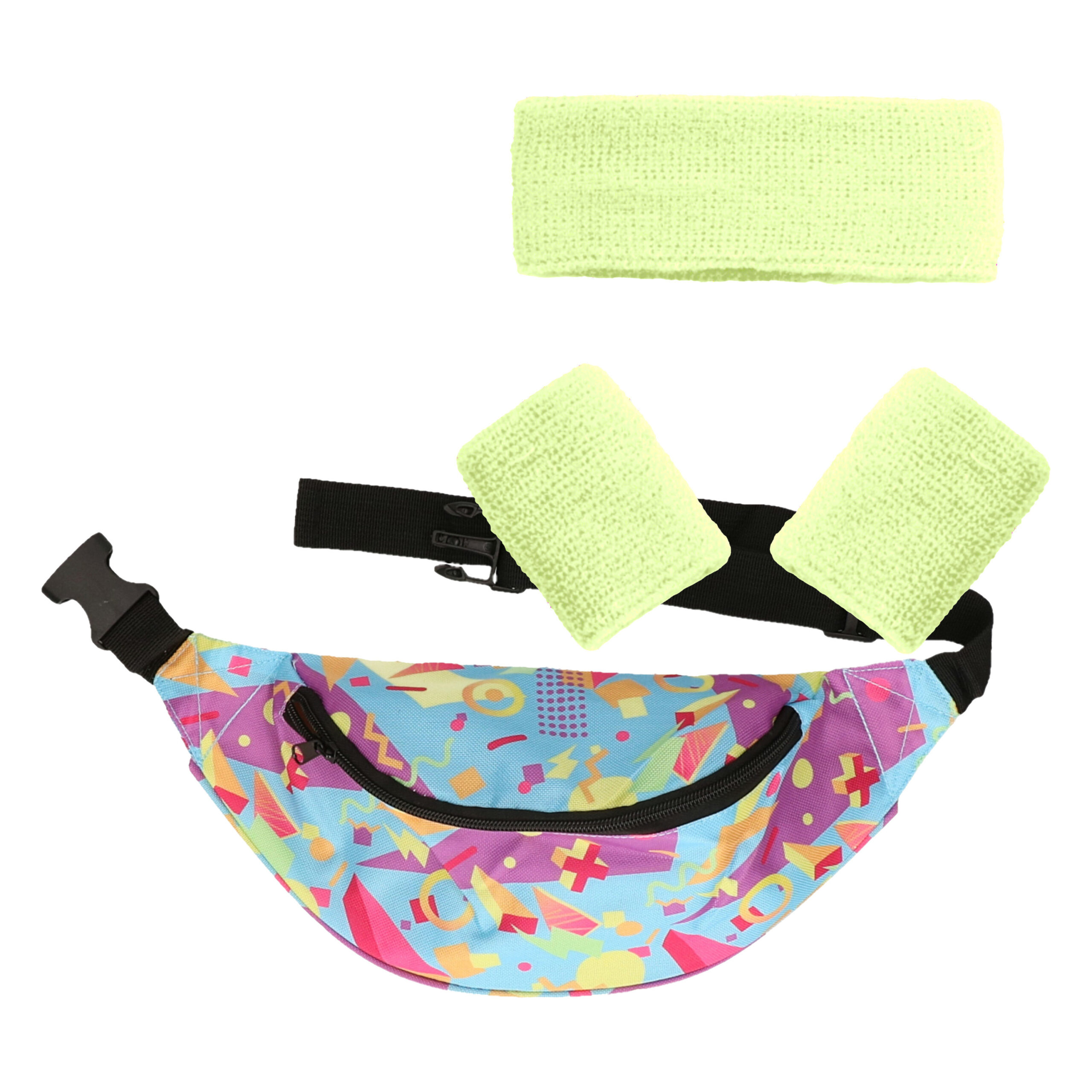 Complete foute 80s/90sparty verkleed accessoire/sieraden set voor dames. Maak de blits met dit kleurrijke setje tijdens je foute feestje of carnaval! Geschikt voor de themas: Eighties, jaren 80, Disco, Celeberties, Popsterren, Foute party. De set bestaat uit een heuptasje, 2x pols zweetbandjes, 1x hoofd zweetband. Materiaal: polyester. , Dit artikel bestaat uit:, 1x Foute 80s/90s print party heuptasje – blauw – jaren 80/90 verkleed accessoires – volwassenen, 1x Foute 80s/90s party verkleed accessoire zweetbandjes set – neon geel – jaren 80/90 thema feestje