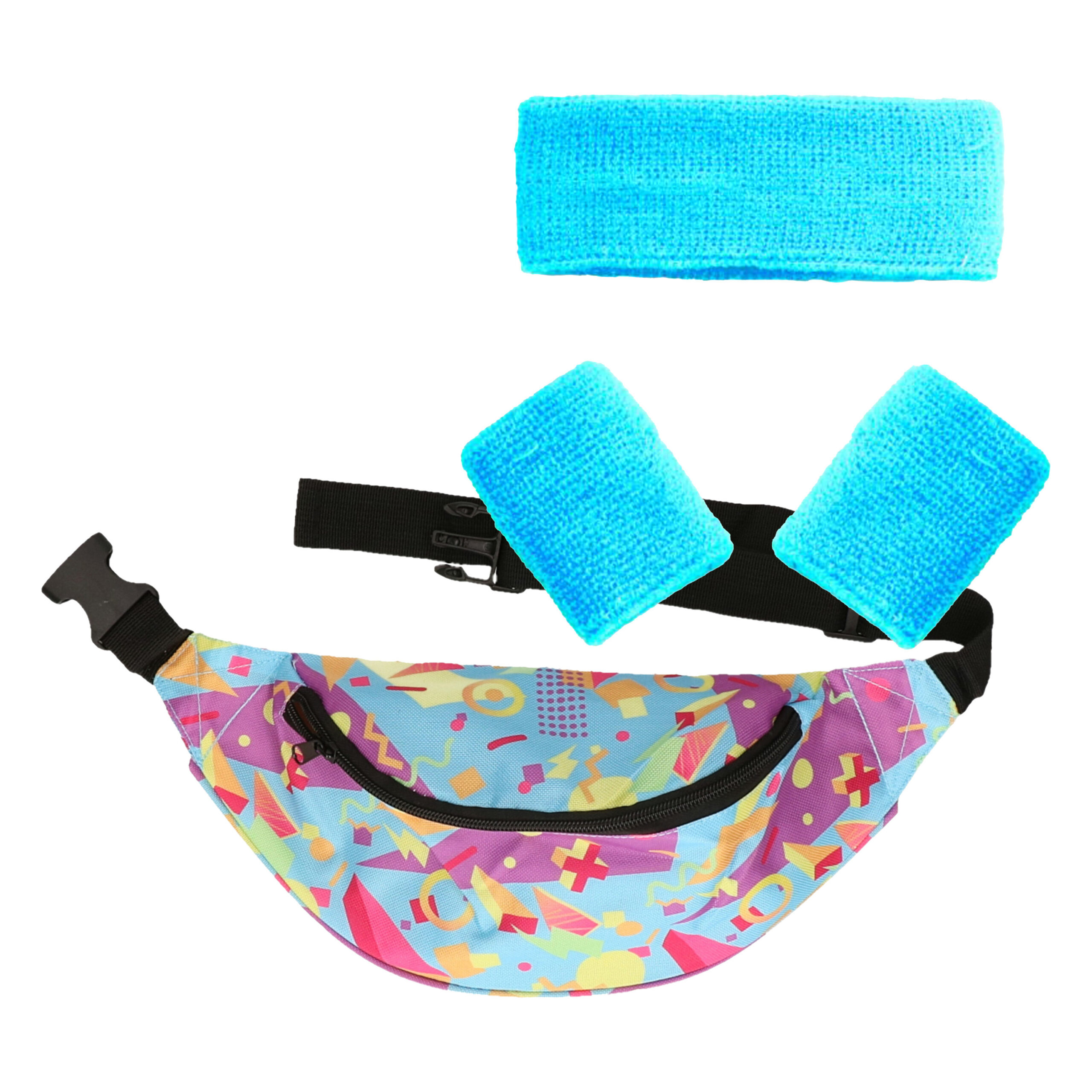 Complete foute 80s/90sparty verkleed accessoire/sieraden set voor dames. Maak de blits met dit kleurrijke setje tijdens je foute feestje of carnaval! Geschikt voor de themas: Eighties, jaren 80, Disco, Celeberties, Popsterren, Foute party. De set bestaat uit een heuptasje, 2x pols zweetbandjes, 1x hoofd zweetband. Materiaal: polyester. , Dit artikel bestaat uit:, 1x Foute 80s/90s print party heuptasje – blauw – jaren 80/90 verkleed accessoires – volwassenen, 1x Foute 80s/90s party verkleed accessoire zweetbandjes set – turquoise – jaren 80/90 thema feestje