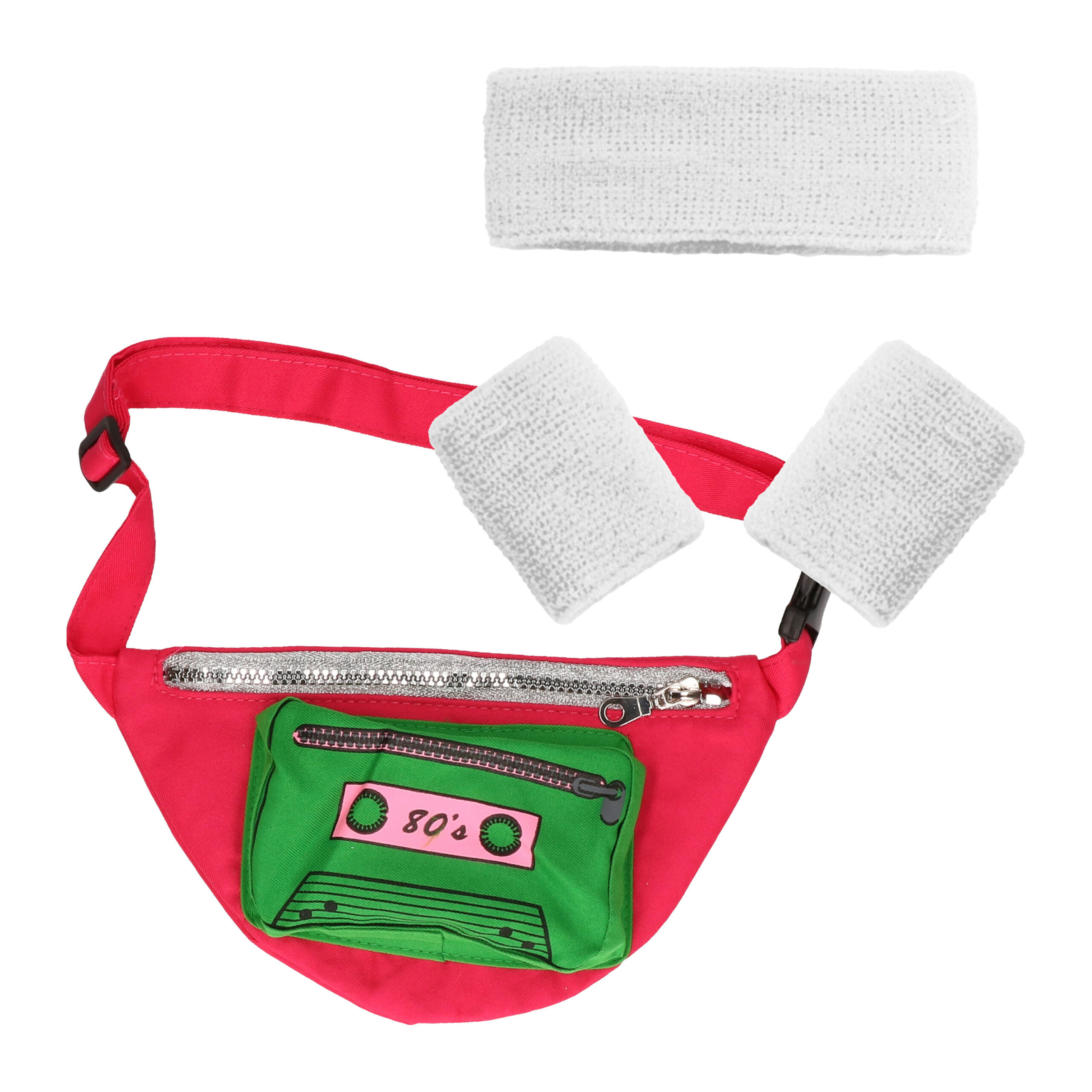 Complete foute 80s/90sparty verkleed accessoire/sieraden set voor dames. Maak de blits met dit kleurrijke setje tijdens je foute feestje of carnaval! Geschikt voor de themas: Eighties, jaren 80, Disco, Celeberties, Popsterren, Foute party. De set bestaat uit een heuptasje, 2x pols zweetbandjes, 1x hoofd zweetband. Materiaal: polyester. , Dit artikel bestaat uit:, 1x Foute 80s/90s print party heuptasje – roze – jaren 80/90 verkleed accessoires – volwassenen, 1x Foute 80s/90s party verkleed accessoire zweetbandjes set – wit – jaren 80/90 thema feestje