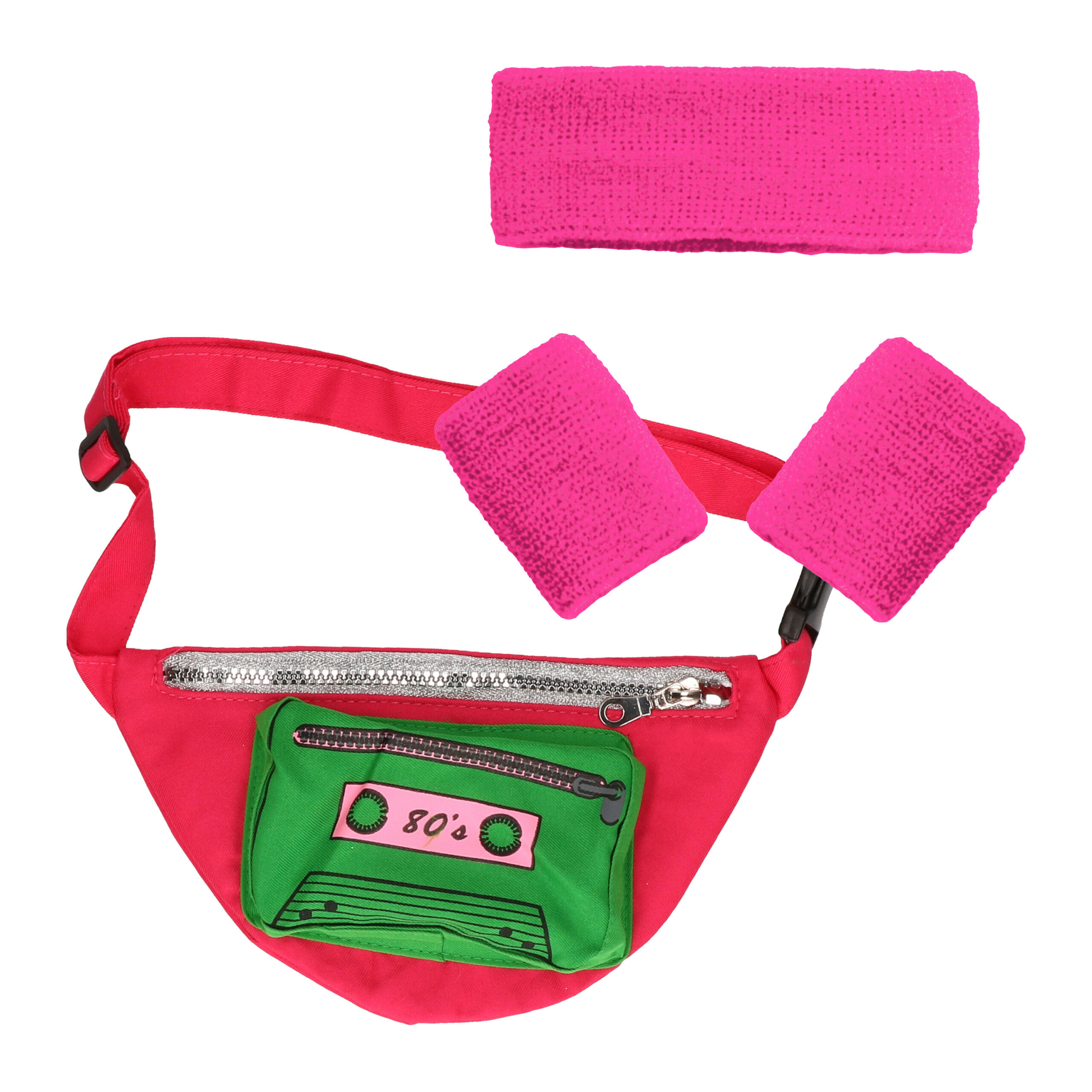 Complete foute 80s/90sparty verkleed accessoire/sieraden set voor dames. Maak de blits met dit kleurrijke setje tijdens je foute feestje of carnaval! Geschikt voor de themas: Eighties, jaren 80, Disco, Celeberties, Popsterren, Foute party. De set bestaat uit een heuptasje, 2x pols zweetbandjes, 1x hoofd zweetband. Materiaal: polyester. , Dit artikel bestaat uit:, 1x Foute 80s/90s print party heuptasje – roze – jaren 80/90 verkleed accessoires – volwassenen, 1x Foute 80s/90s party verkleed accessoire zweetbandjes set – neon roze- jaren 80/90 thema feestje