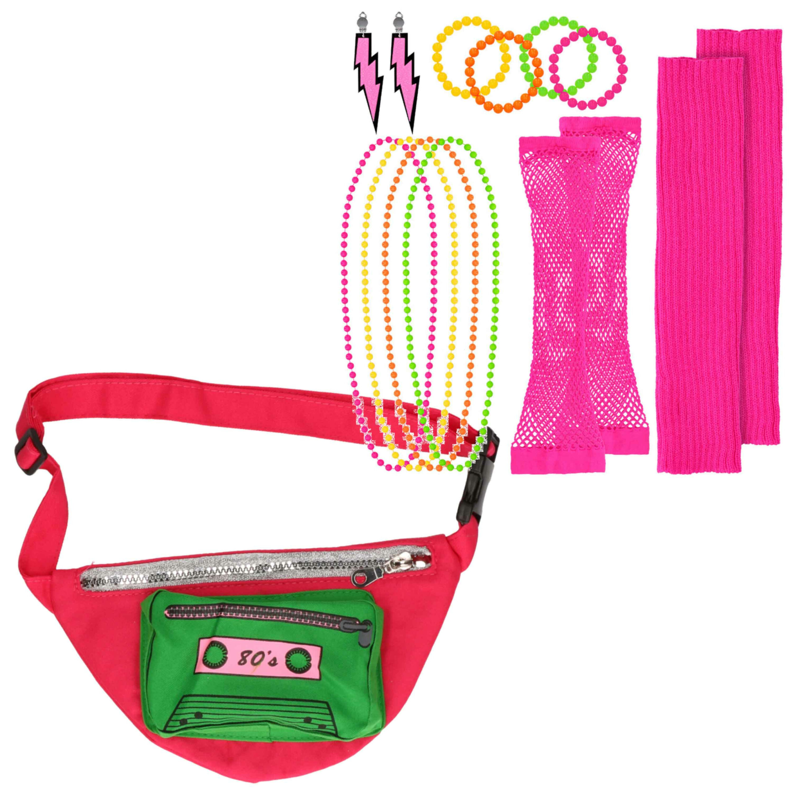 Complete foute 80s/90sparty verkleed accessoire/sieraden set voor dames. Maak de blits met dit kleurrijke setje tijdens je foute feestje of carnaval! Geschikt voor de themas: Eighties, jaren 80, Disco, Celebraties, Popsterren, Foute party. De set bestaat uit een heuptasje, oorbellen, kettingen, armbandjes en handschoenen. , Dit artikel bestaat uit:, 1x Foute 80s/90s print party heuptasje – roze – jaren 80/90 verkleed accessoires – volwassenen, 1x Foute 80s/90s party verkleed accessoire set – 5-delig – jaren 80/90 thema feestje