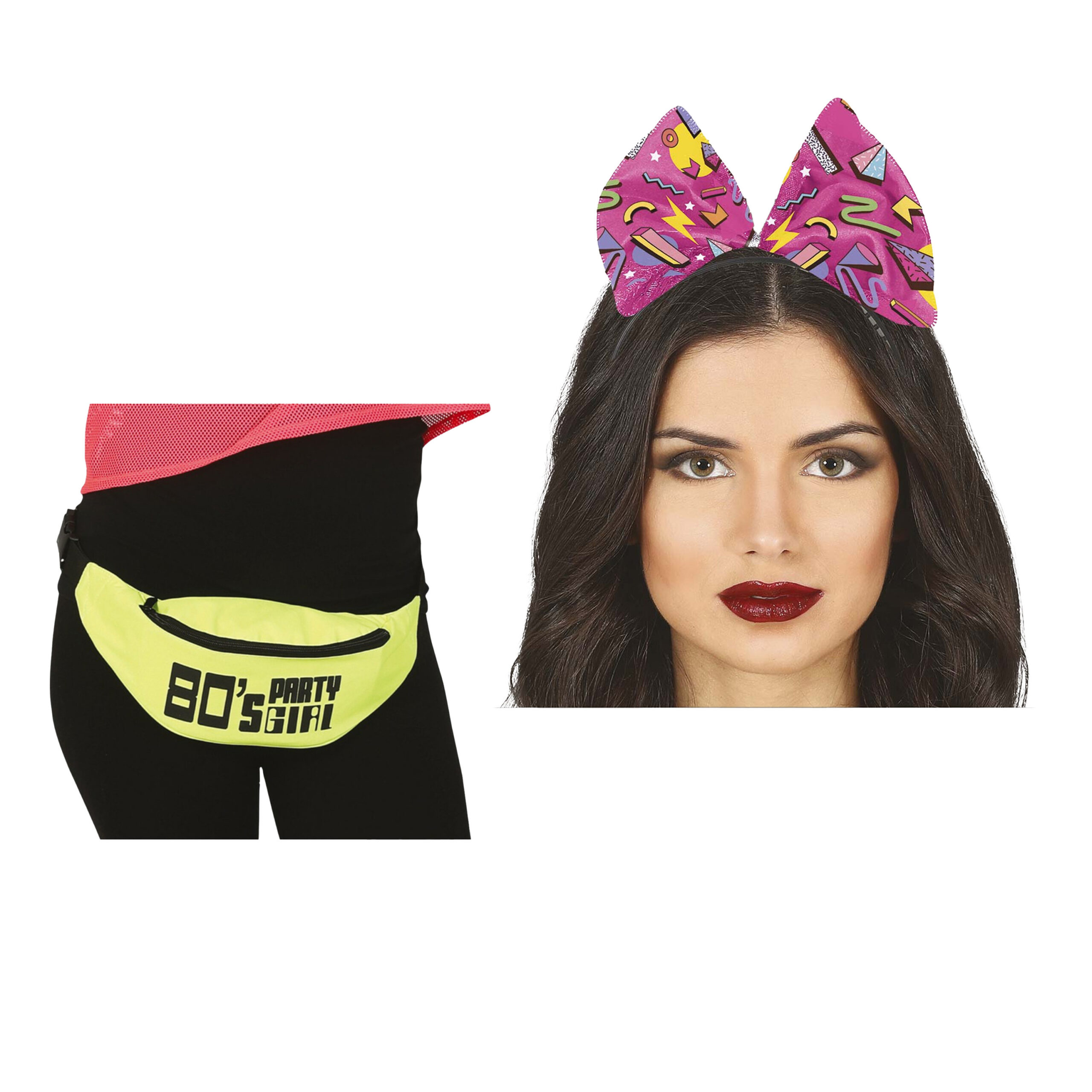 Foute 80s/90sparty verkleed accessoire/sieraden set voor dames. Maak de blits met dit kleurrijke setje tijdens je foute feestje of carnaval! Geschikt voor de themas: Eighties, jaren 80, Disco, Celebraties, Popsterren, Foute party. De set bestaat uit een kleurrijke pet en een heuptasje waarin je al je benodigdheden voor een geslaagd feestje in kwijt kunt! Let op: dit is een verkleedaccessoire voor volwassenen, geen speelgoed. , Dit artikel bestaat uit:, 1x Foute 80s/90s print party heuptasje – neon geel – jaren 80/90 verkleed accessoires – volwassenen, 1x Verkleed diadeem met strik – roze – foute 80s/90s party themafeest accessoires voor dames