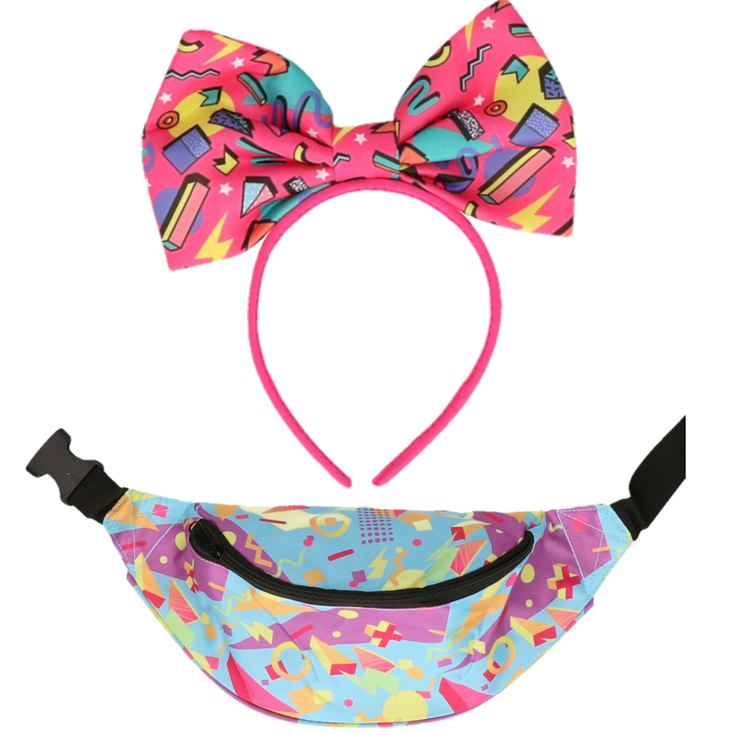 Foute 80s/90sparty verkleed accessoire/sieraden set voor dames. Maak de blits met dit kleurrijke setje tijdens je foute feestje of carnaval! Geschikt voor de themas: Eighties, jaren 80, Disco, Celebraties, Popsterren, Foute party. De set bestaat uit een kleurrijke pet en een heuptasje waarin je al je benodigdheden voor een geslaagd feestje in kwijt kunt! , Dit artikel bestaat uit:, 1x Foute 80s/90s print party heuptasje – blauw – jaren 80/90 verkleed accessoires – volwassenen, 1x Verkleed diadeem met strik – roze – foute 80s/90s party themafeest accessoires voor dames