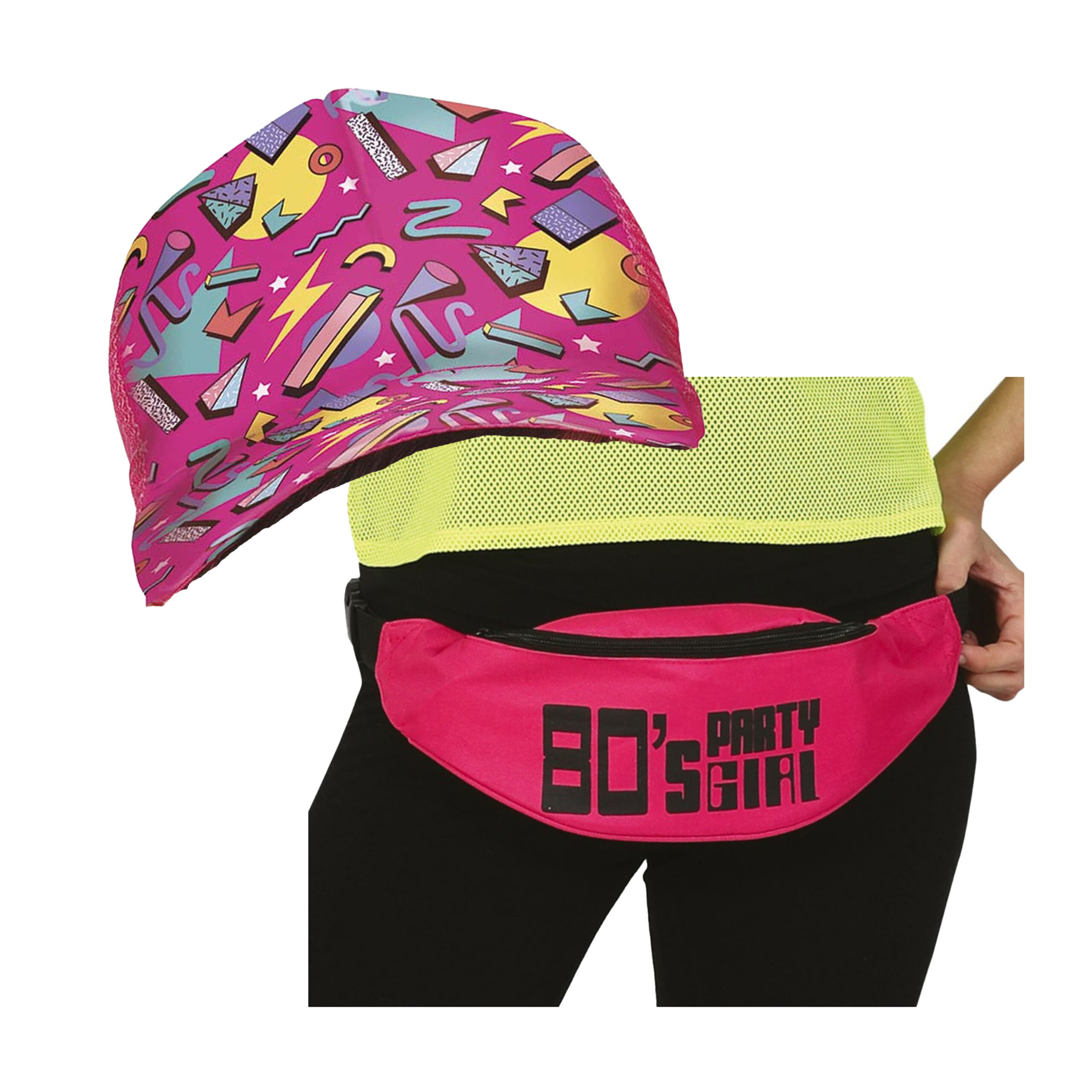 Foute 80s/90sparty verkleed accessoire/sieraden set voor dames. Maak de blits met dit kleurrijke setje tijdens je foute feestje of carnaval! Geschikt voor de themas: Eighties, jaren 80, Disco, Celebraties, Popsterren, Foute party. De set bestaat uit een kleurrijke pet en een heuptasje waarin je al je benodigdheden voor een geslaagd feestje in kwijt kunt! Let op: dit is een verkleedaccessoire voor volwassenen, geen speelgoed. , Dit artikel bestaat uit:, 1x Foute 80s/90s print party pet – roze – jaren 80/90 verkleed accessoires – volwassenen onze size, 1x Foute 80s/90s print party heuptasje – fuchsia roze – jaren 80/90 verkleed accessoires – volwassenen
