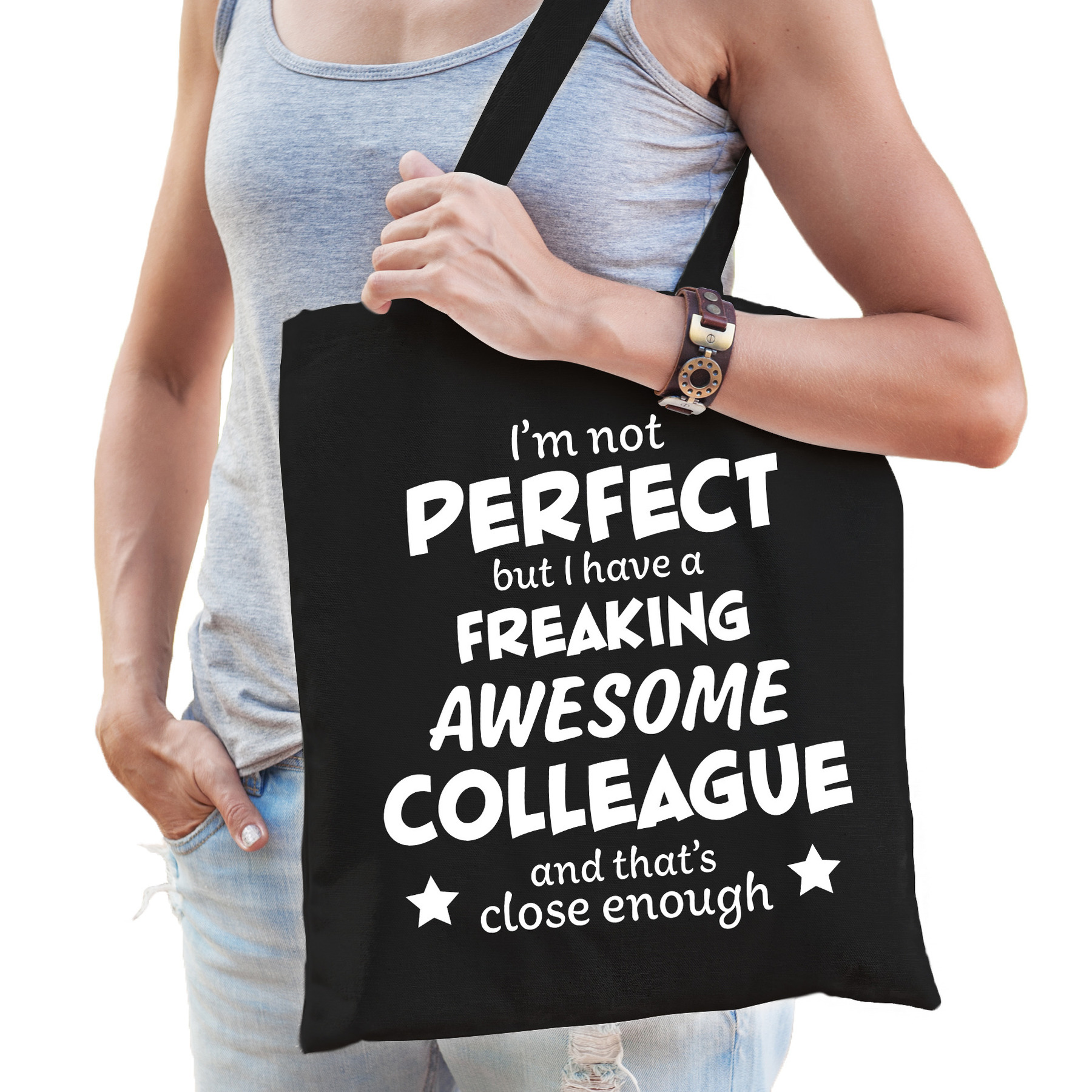Freaking awesome colleague – geweldige beste collega cadeau tas zwart dames. Op dit zwarte tasje staat groot de tekst: I’m not PERFECT but i have a FREAKING AWESOME COLLEAGUE and that is close enough.