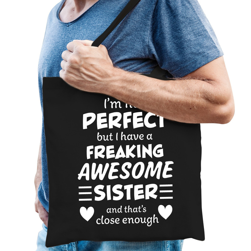 Freaking awesome sister – geweldige zus cadeau tas zwart heren. Dit zwarte katoenen tasje is eenzijdig bedrukt met de tekst: I’m not perfect but i have a freaking awesome sister and that is close enough.
