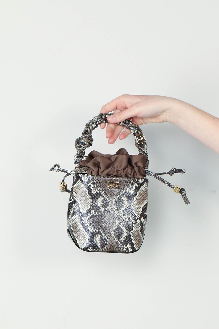 Bou bucket mini van Ganni met slangenprint Stofsamenstelling: 100% polyester Afneembare en verstelbare schouderband Trekkoordsluiting Gevlochten bovenhengsel Ganni Butterfly logo Over GANNI Van insiders geheim tot wereldwijd fenomeen; fashion brand Ganni heeft in een korte tijd een enorme groei gekend! Hoewel het merk in 2000 al werd opgericht door galeriehouder Frans Truelsen, begon het merk eind jaren 2010, nadat het werd overgenomen door echtpaar Nicolaj Reffstrup en Ditte Reffstrup, pas écht bekendheid te genereren. Het merk wordt door kenners beschreven als een betaalbaar luxemerk. Zelf noemen Nicolaj en Ditte Ganni een ’sweet spot’; het merk zit volgens hun tussen fast-fashion en high-fashion in. Trendy én betaalbaar dus. That’s what we like!