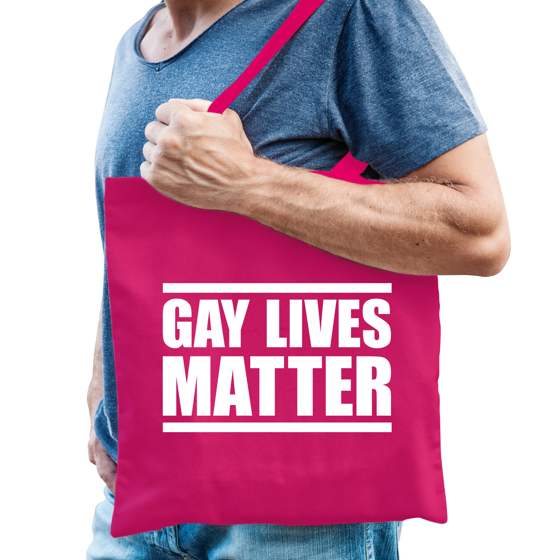 Gay lives matter anti homo discriminatie katoenen tasje fuchsia roze voor heren. Op deze fuchsia roze demonstratie / protest tas staat: Gay lives matter. De tas / shopper is te dragen tijdens bijvoorbeeld een demonstratie / betoging, tijdens een gay evenement / gay pride of om gewoon een statement te maken.