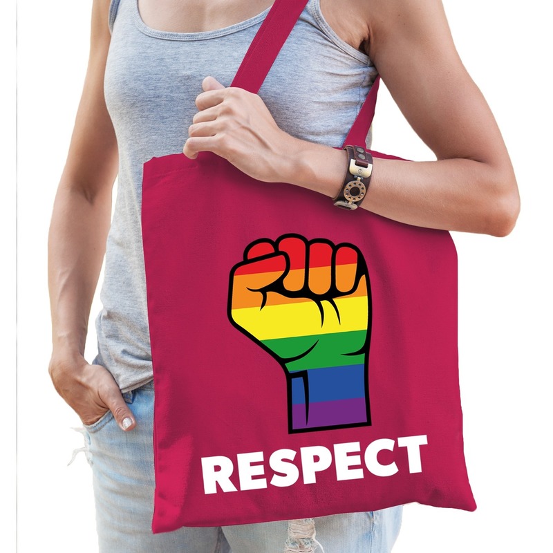 Katoenen respect gaypride tas roze. Dit fuchsia roze katoenen tasje is eenzijdig bedrukt met de tekst Respect en de afbeelding van een gebalde vuist in regenboog kleuren. Gaypride accessoire.