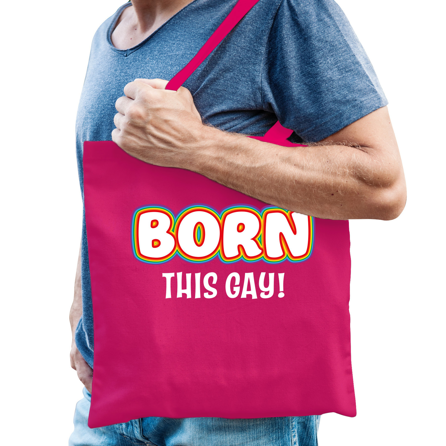 Bellatio Decorations Gay Pride tas/shopper in de kleur fuchsia roze. De tas is eenzijdig bedrukt met de tekst: Born this gay. Ideaal om mee te nemen naar Gay Pride/parade. Match de tas bijvoorbeeld met het t-shirt! Materiaal: 100% katoen, 140 grams kwaliteit. Formaat vak: ca. 42 x 38 cm. Totale lengte inclusief hengsel: ca. 67 cm. Inhoud: ca. 10 liter.