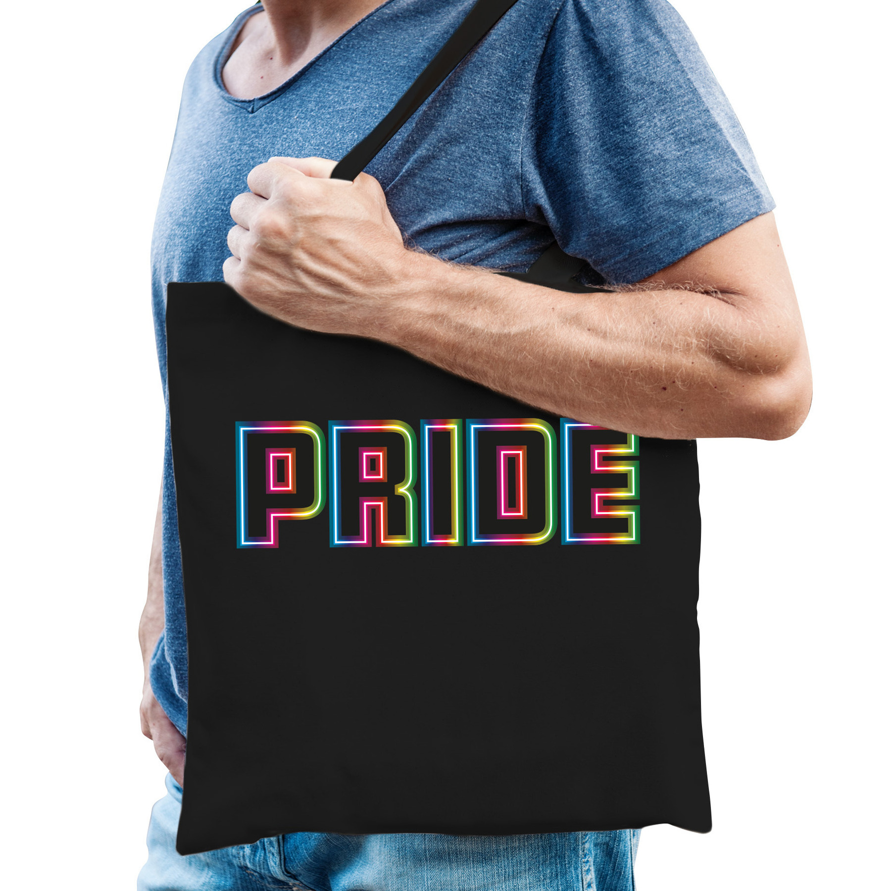 Bellatio Decorations Gay Pride tas/shopper in de kleur zwart. De tas is eenzijdig bedrukt met de tekst: PRIDE in neon letters. Ideaal om mee te nemen naar Gay Pride/parade. Match de tas bijvoorbeeld met het t-shirt! Materiaal: 100% katoen, 140 grams kwaliteit. Formaat vak: ca. 42 x 38 cm. Totale lengte inclusief hengsel: ca. 67 cm. Inhoud: ca. 10 liter.