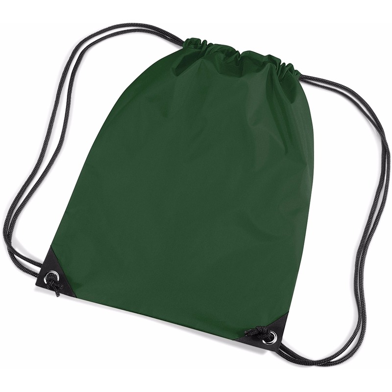 Nylon gymtas in het donkergroen van waterafstotende stof en reigkoord. Inhoud: 12 liter. Afmeting: 45 x 34 cm.