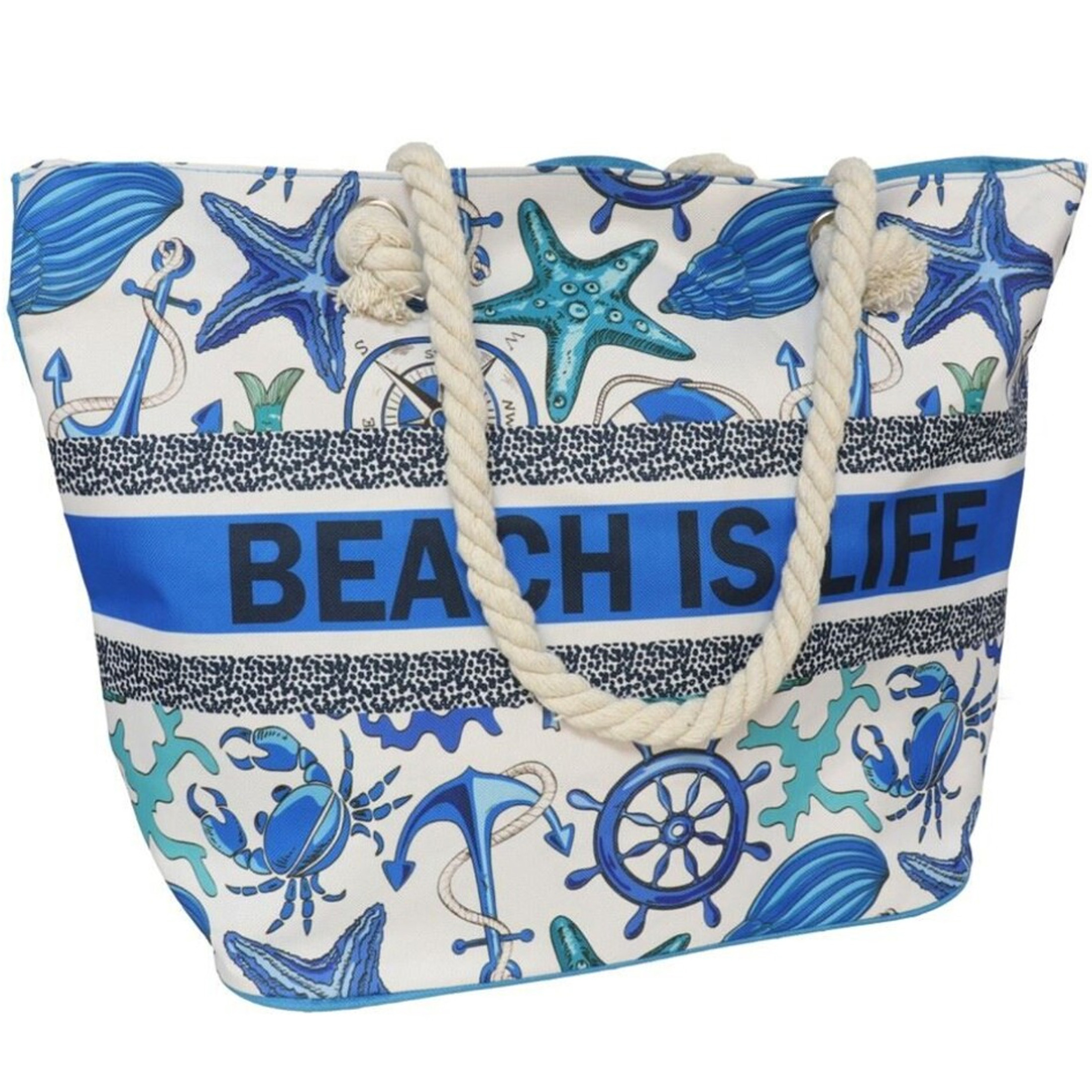 Deze maritieme strandtas van Gerimport is een fijne metgezel voor elke stranddag. De blauwe tas heeft een frisse look met de tekst ?Beach is life? en maritieme accenten die passen bij zon, zee en zand. Met het ruime formaat en de stevige touw handvatten neem je moeiteloos je handdoek, zonnebrand en snacks mee.