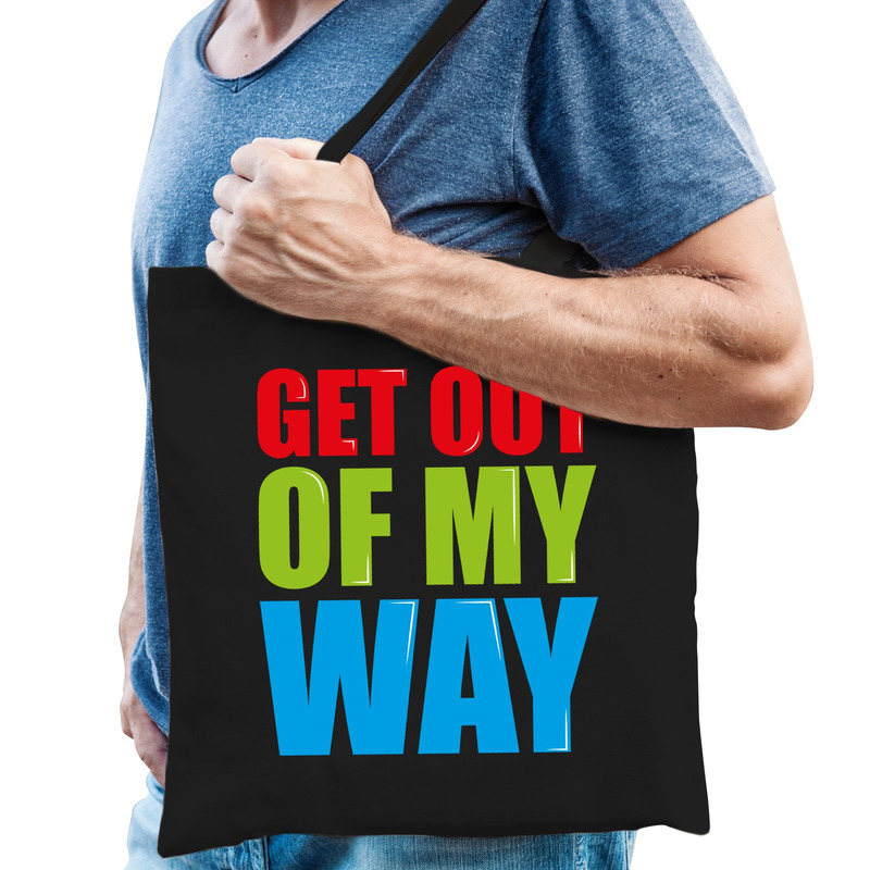 Get out of my way fun tekst kado katoenen tas zwart voor heren. Dit zwart katoenen tasje is eenzijdig bedrukt met de tekst: Get out of my way.