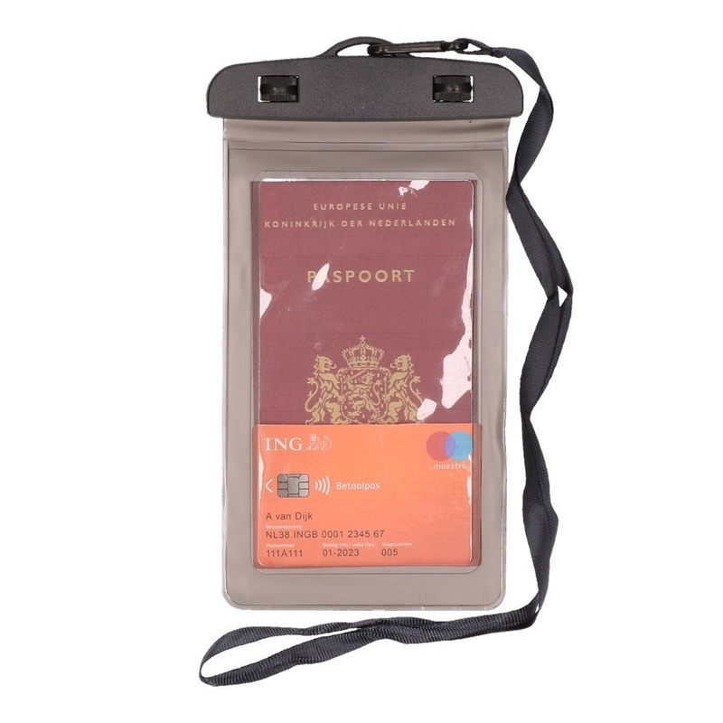 Waterdicht documententasje/ waardvolle spullen hoesje grijs. Handig hoesje om uw paspoort, pinpas of andere waardevolle spullen droog of stofvrij te houden. Formaat 10.5×17.5 cm met keycord. Let op: Test de waterdichtheid voor gebruik, bijvoorbeeld met een stuk papier. Waterdicht reistasje, documententasje voor op vakantie, reisdocumenten hoesje voor op reis, veiligheidstasje voor waardevolle nektasje documenten.