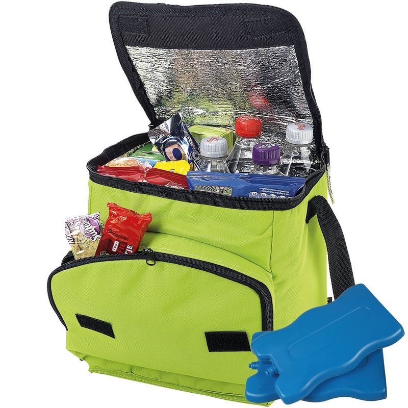 Grote luxe opvouwbare groene koeltas met 8 koelelementen. De koeltas heeft 2 vakken en een formaat van 23 x 19 x 25 cm. Inhoud: 10 liter. Materiaal: polyester.