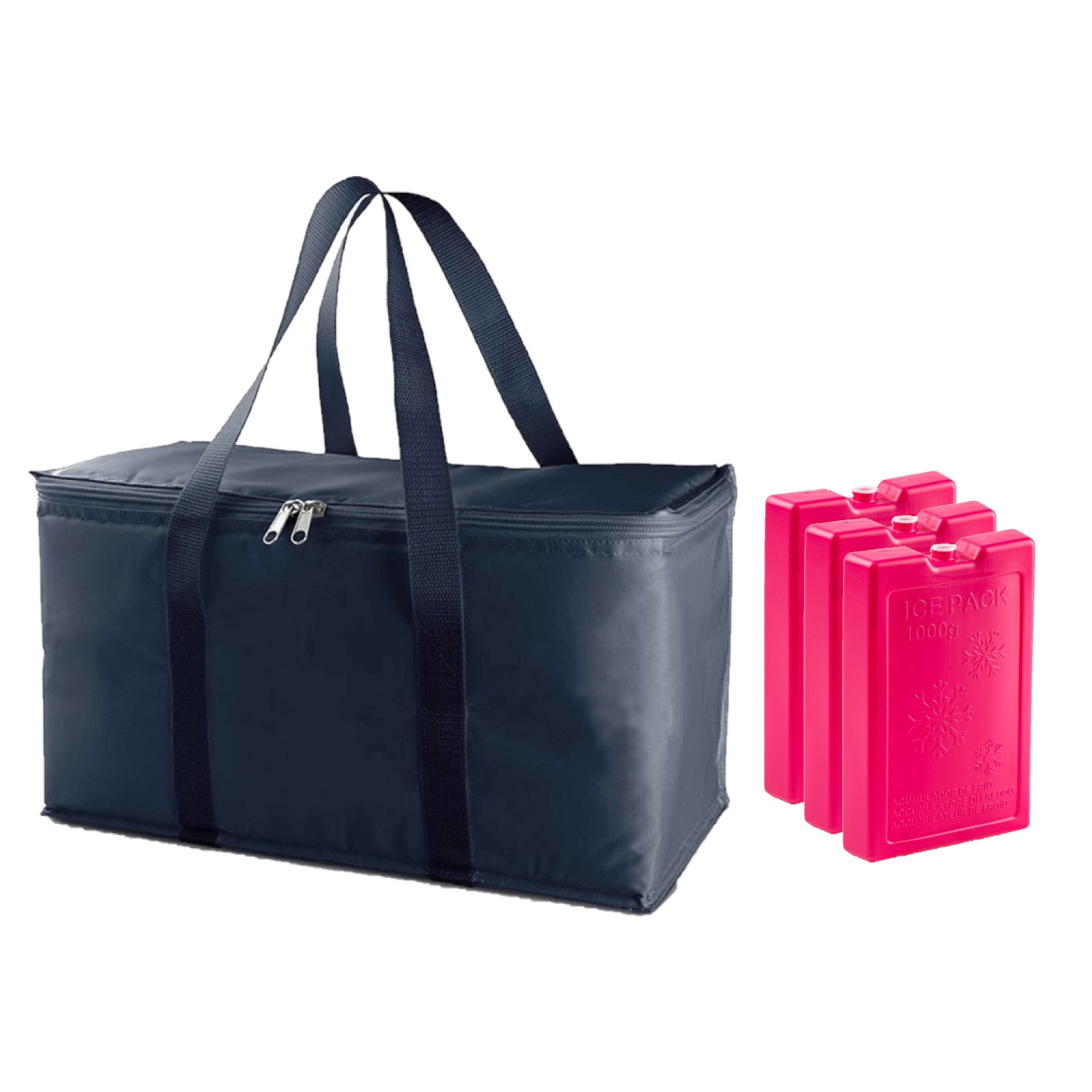 Grote koeltas blauw 39 x 22 x 19 cm met 3x stuks roze koelelementen. De koeltas heeft een ge?soleerd hoofdvak en ruimte voor minimaal 12 blikjes. Het formaat van de tas is ongeveer 39 x 22 x 19 cm. Inhoud: ongeveer 17 liter. Materiaal: polyester. Koeltassen voor een dagje strand, picknick, vakantie of onderweg. De koelelementen zijn van 1000 gram per stuk(formaat 22 x 14.5 cm). , Dit artikel bestaat uit:, 1x Grote koeltas navy/blauw 17 liter, 3x Koelelementen van 1000 gram – roze – 22 x 14.5 x 3.5 cm – voor koeltas en koelbox