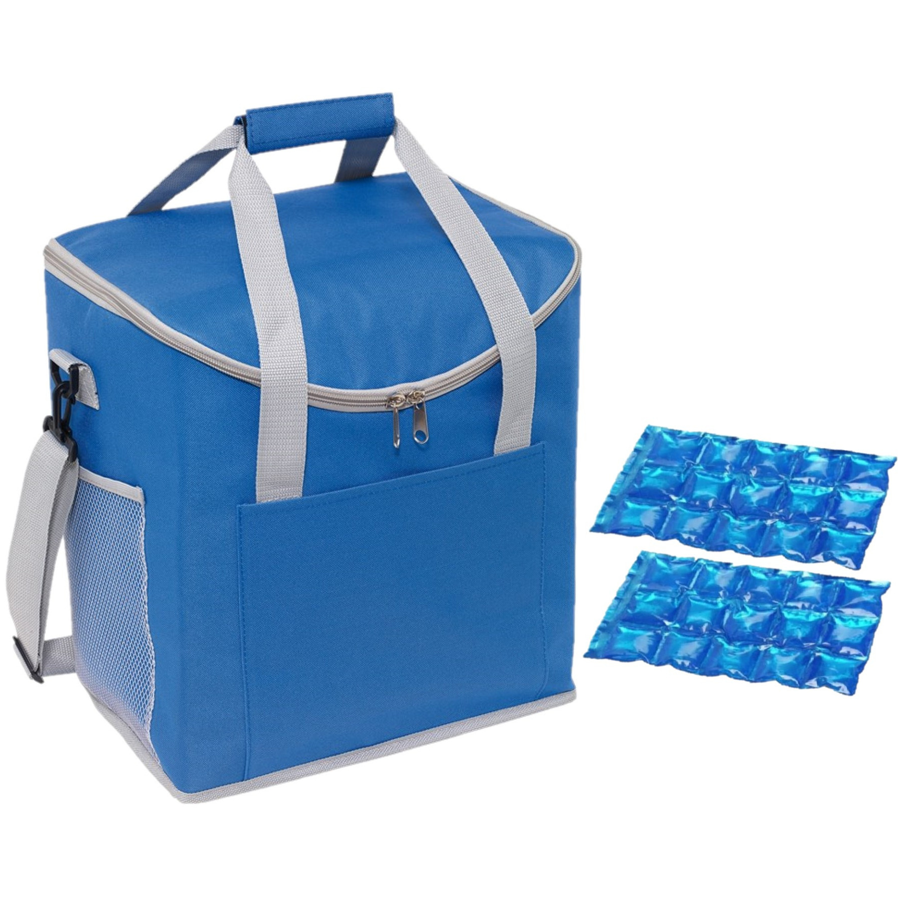 Grote koeltas blauw met 2 stuks flexibele koelelementen. De flexibele koelelementen zijn herbruikbaar. Afmeting koeltas: ca. 32 x 23 x 37 cm. Inhoud koeltas: ca 27 liter. Materiaal koeltas: polyester. , Dit artikel bestaat uit:, 2x 1x Stuks herbruikbare flexibele koelelementen icepack 15 x 25 cm, 1x Grote drankjes en voedsel koeltas – blauw – 32 x 23 x 37 cm – 27 liter – Koeltassen