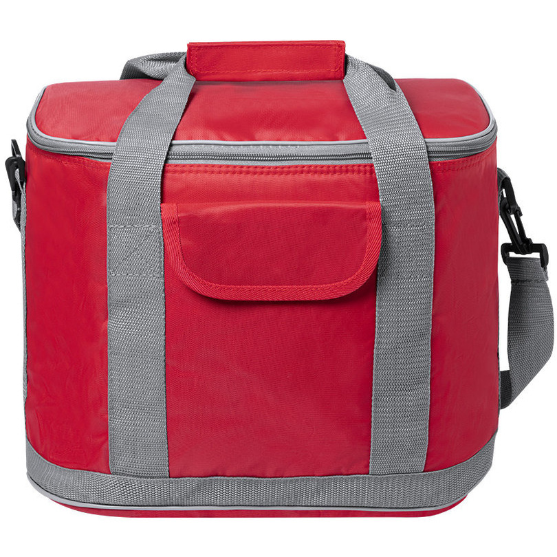 Grote koeltas draagtas/schoudertas met voorvak en lange hengels. Kleur: rood. Afmeting: ca. 37 x 29 x 21 cm. Inhoud: ca. 22 liter. Materiaal: polyester.