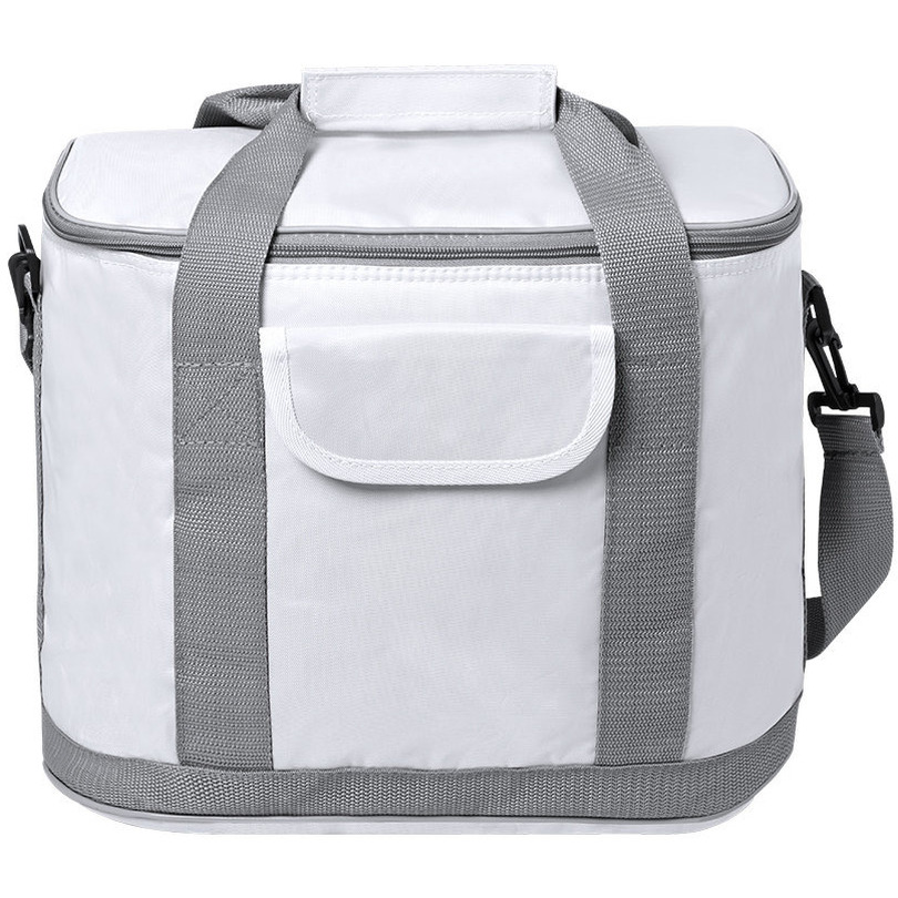 Grote koeltas draagtas/schoudertas met voorvak en lange hengels. Kleur: wit. Afmeting: ca. 37 x 29 x 21 cm. Inhoud: ca. 22 liter. Materiaal: polyester.