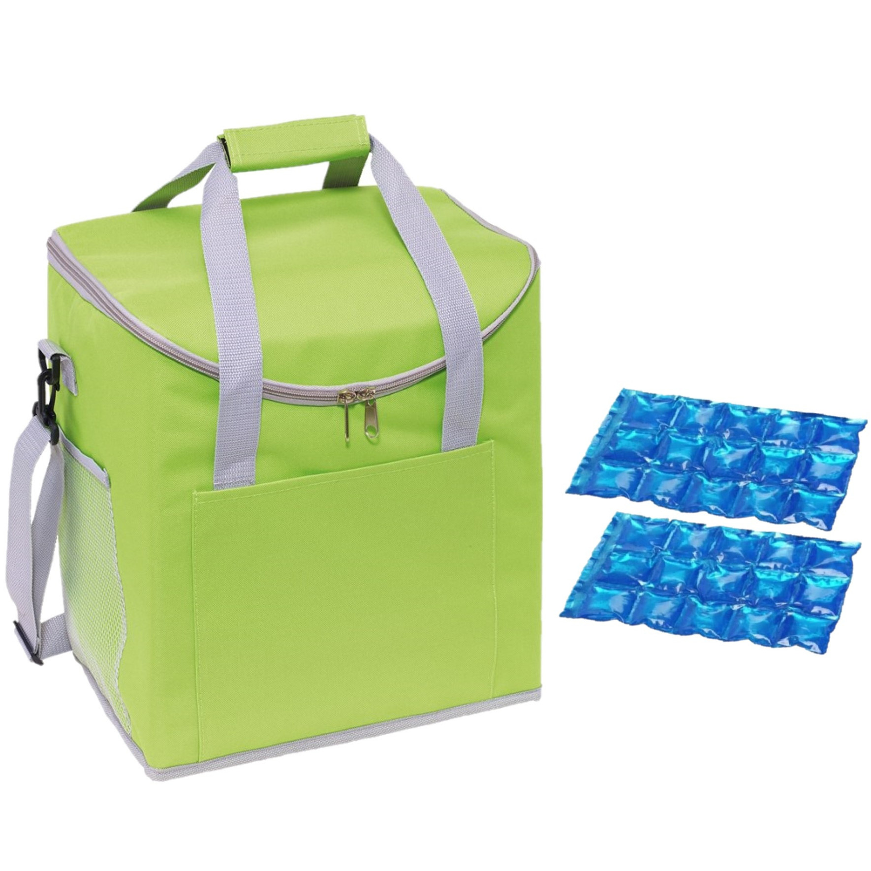 Grote koeltas groen met 2 stuks flexibele koelelementen. De flexibele koelelementen zijn herbruikbaar. Afmeting koeltas: ca. 32 x 23 x 37 cm. Inhoud koeltas: ca 27 liter. Materiaal koeltas: polyester. , Dit artikel bestaat uit:, 2x 1x Stuks herbruikbare flexibele koelelementen icepack 15 x 25 cm, 1x Grote drankjes en voedsel koeltas – groen – 32 x 23 x 37 cm – 27 liter – Koeltassen