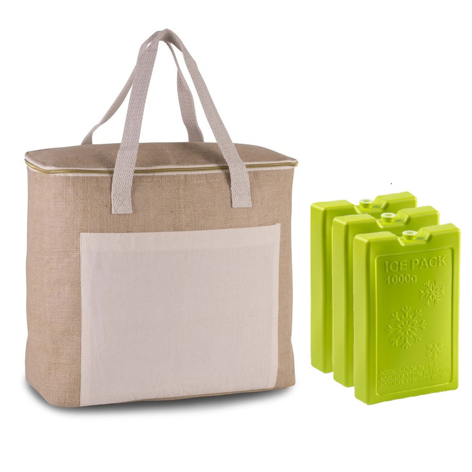 Grote koeltas jute/canvas 20 liter en 38 x 32 x 16 cm met 3x stuks koelelementen blauw