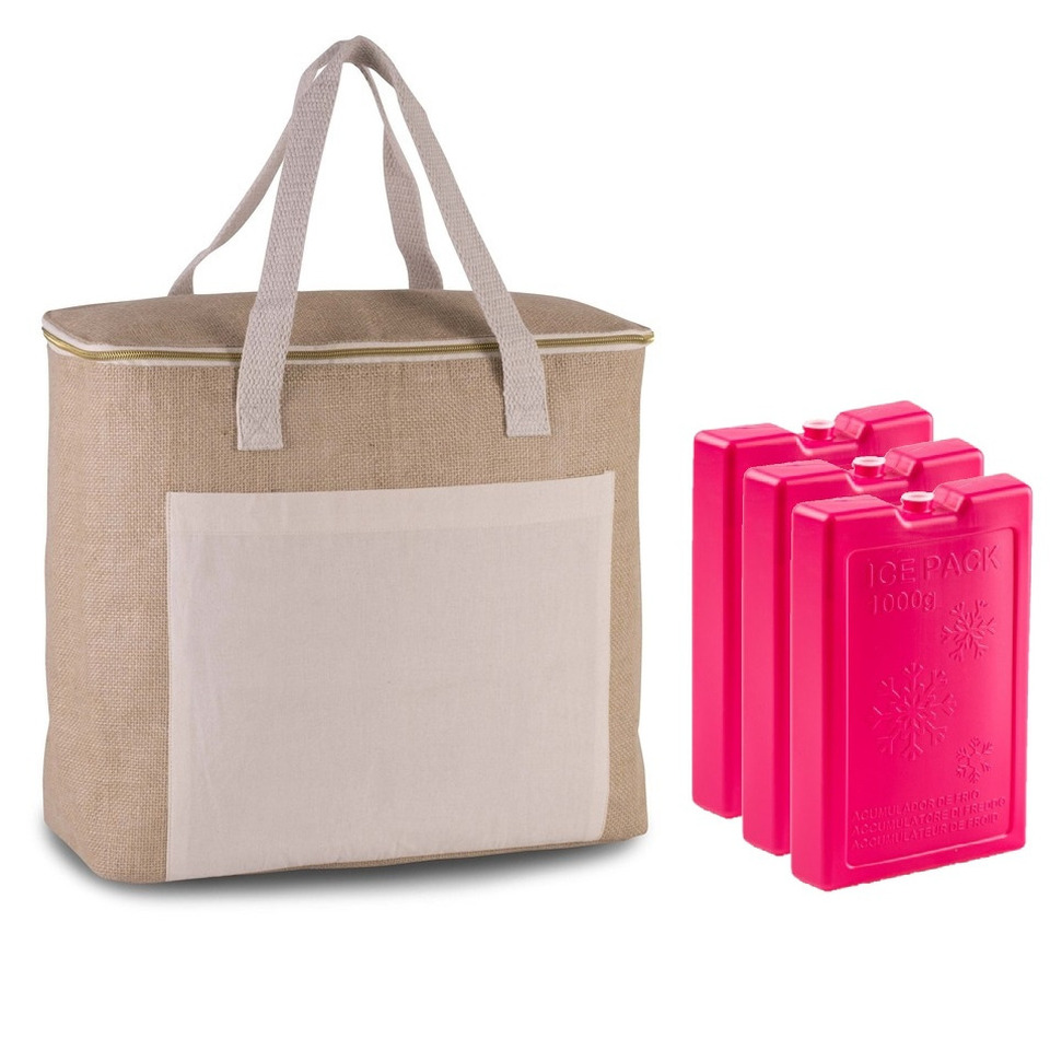 Grote koeltas jute/canvas naturel 20 liter. De koeltas heeft een groot geisoleerd hoofdvak. Het formaat van de tas is ongeveer 38 x 32 x 16 cm. Inhoud: ongeveer 20 liter. Materiaal: polyester. Koeltassen voor een dagje strand, picknick, vakantie of onderweg. De 3x stuks koelelementen zijn roze en 100 gram (22 x 14.5 cm per stuk). , Dit artikel bestaat uit:, 1x Kimood Grote koeltas jute/canvas – 38 x 32 x 16 cm – 20 liter – Koeltassen, 3x Koelelementen van 1000 gram – roze – 22 x 14.5 x 3.5 cm – voor koeltas en koelbox