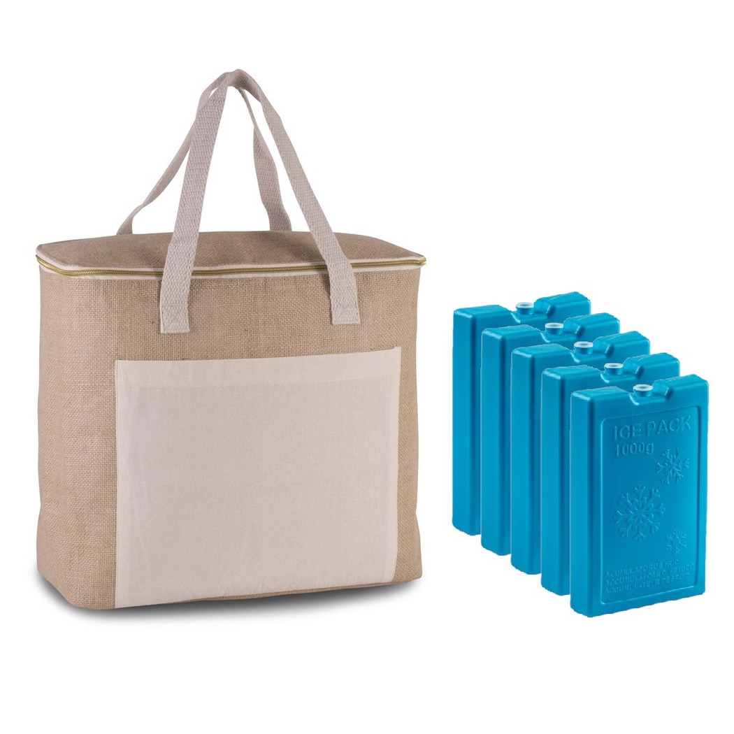 Grote koeltas jute/canvas naturel 20 liter. De koeltas heeft een groot geisoleerd hoofdvak. Het formaat van de tas is ongeveer 38 x 32 x 16 cm. Inhoud: ongeveer 20 liter. Materiaal: polyester. Koeltassen voor een dagje strand, picknick, vakantie of onderweg. De 5x stuks koelelementen zijn blauw en 100 gram (22 x 14.5 cm per stuk). , Dit artikel bestaat uit:, 1x Kimood Grote koeltas jute/canvas – 38 x 32 x 16 cm – 20 liter – Koeltassen, 5x Koelelementen van 1000 gram – blauw – 22 x 14.5 x 3.5 cm – voor koeltas en koelbox