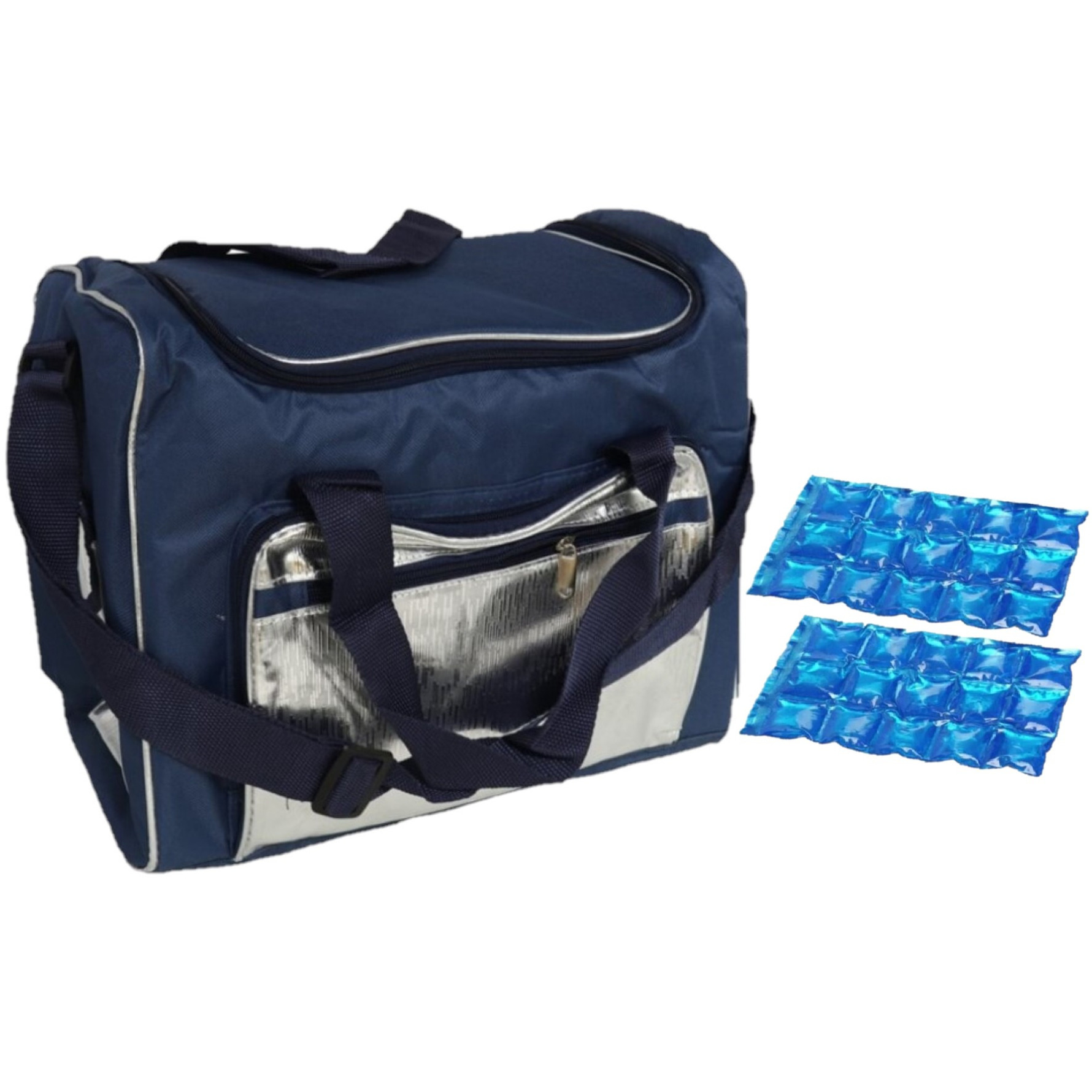 Grote koeltas schoudertas blauw/zilver met 2 stuks flexibele koelelementen. De flexibele koelelementen zijn herbruikbaar. Afmeting koeltas: ca. 36 x 22 x 30 cm. Inhoud koeltas: ca. 21 liter. Materiaal koeltas: polyester. , Dit artikel bestaat uit:, 2x 1x Stuks herbruikbare flexibele koelelementen icepack 15 x 25 cm, 1x Grote koeltas schoudertas blauw/zilver 36 x 22 x 30 cm 21 liter