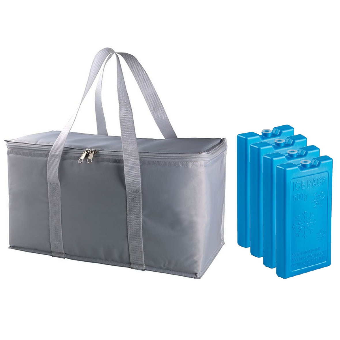 Grote koeltas zilver/grijs 39 x 22 x 19 cm met 4x stuks koelelementen. De koeltas heeft een ge?soleerd hoofdvak en ruimte voor minimaal 12 blikjes. Het formaat van de tas is ongeveer 39 x 22 x 19 cm. Inhoud: ongeveer 17 liter. Materiaal: polyester. Koeltassen voor een dagje strand, picknick, vakantie of onderweg. De koelelementen zijn van 500 gram per stuk. , Dit artikel bestaat uit:, 1x Grote koeltas zilver/grijs 17 liter, 4x PlasticForte Koelelementen – 500 grams – 1x – 20 cm – blauw