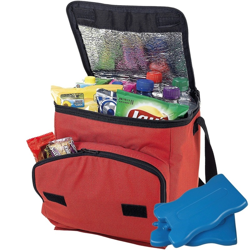 Grote luxe opvouwbare rode koeltas met 8 koelelementen. De koeltas heeft 2 vakken en een formaat van 23 x 19 x 25 cm. Inhoud: 10 liter. Materiaal: polyester.
