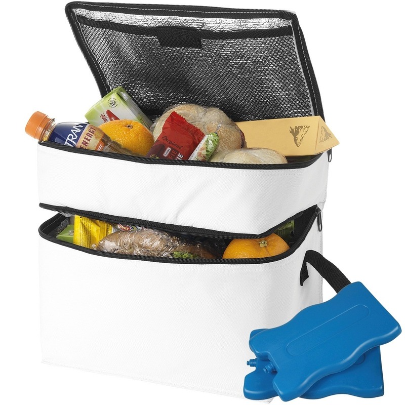 Luxe opvouwbare witte koeltas met 6 koelelementen. De koeltas heeft 2 vakken boven elkaar en een formaat van 30 x 24 x 20 cm. Materiaal: polyester. , Dit artikel bestaat uit:, 1x Koeltas 14.7 Liter – Wit – 2 compartimenten – 30 x 25 x 20 cm – Polyester, 3x Koelelementen 500 gram 2 stuks