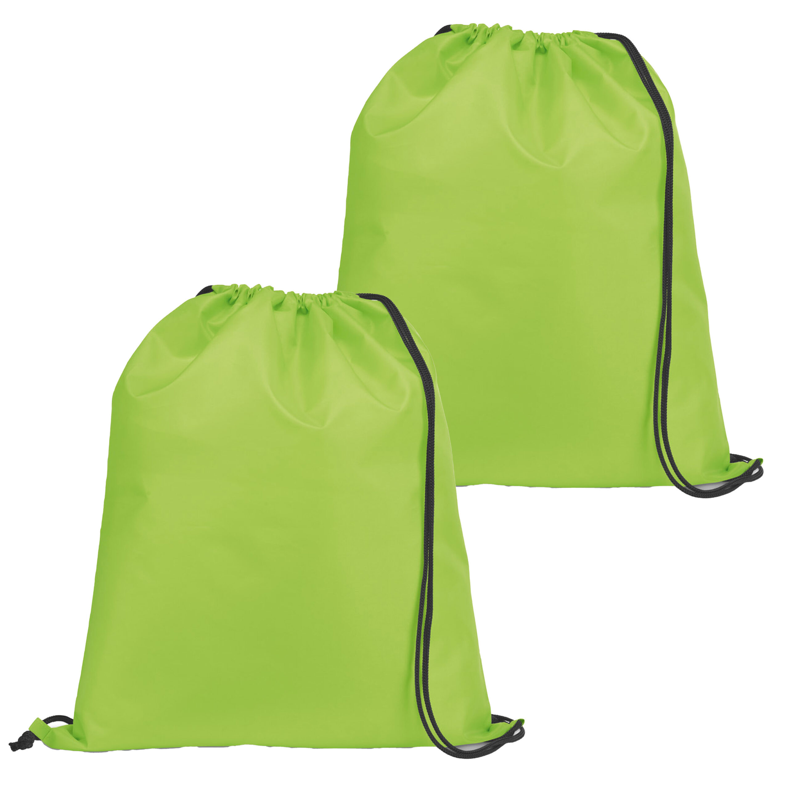 2x gymtas/lunchtas/zwemtas met rijgkoord voor kinderen in de kleur lime groen. Handige gymtasjes voorzien van een rijgkoord zodat je deze kan afsluiten en op je rug kan dragen. Materiaal: Polyester. Afmeting gymtassen: 35 x 41 cm. Inhoud: 3 liter. Multifunctionele opbergtassen met vele toepassingen.