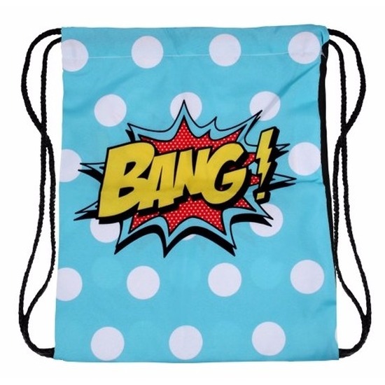 Rugtas met rijgkoord Bang! Blauwe rugtas met witte stippen en pop-art afbeelding. De achterzijde van de rugtas is zwart. Materiaal: 100% polyester. Afmeting: ongeveer 38 x 30 cm.