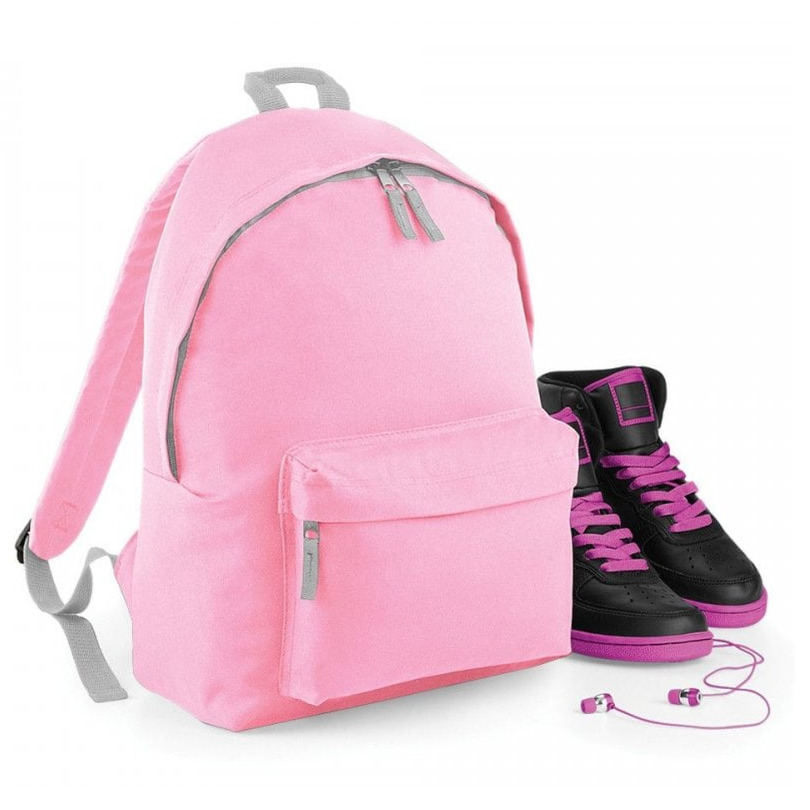 Hippe rugtas met voorvak voor kinderen. De rugtas is van het merk BagBase en gemaakt van polyester. De rugtas heeft een extra voorvak met ritssluiting, een gevulde rugsteun en een inhoud van ongeveer 14 liter. Formaat: 38 x 28 x 19 cm.
