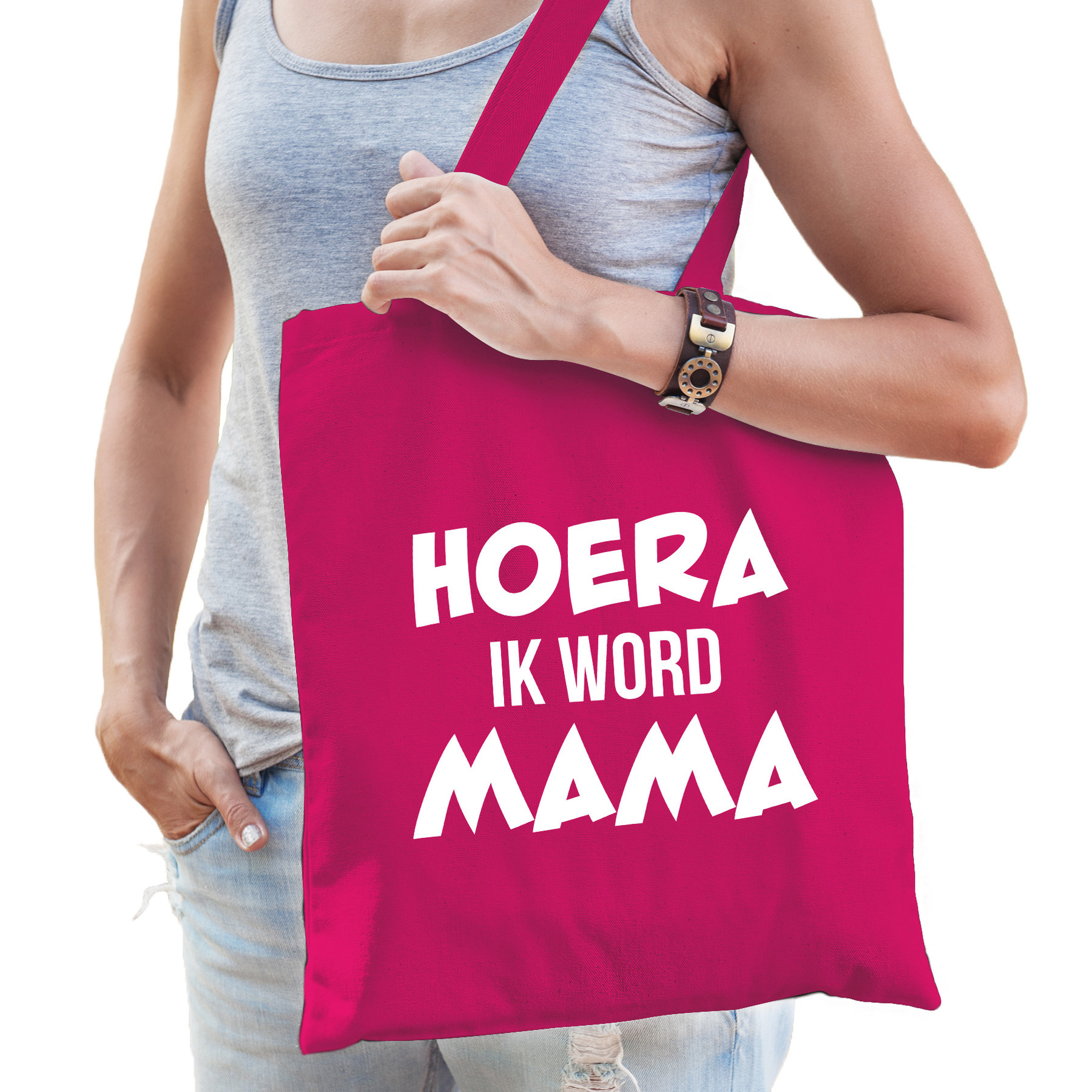 Dit fuchsia roze katoenen tasje is eenzijdig bedrukt met de tekst: Hoera ik word mama.